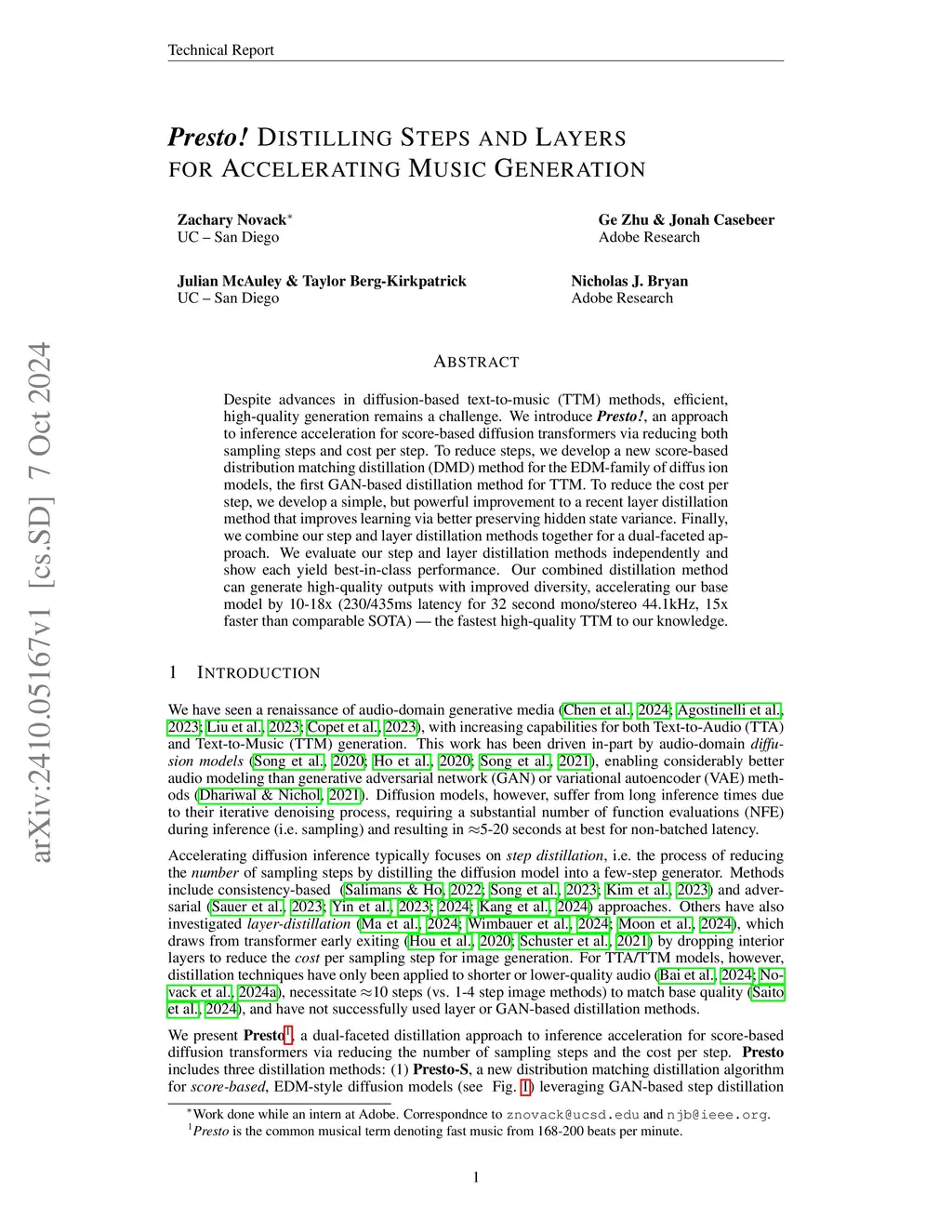 Despite advances in diffusion-based text-to-music (TTM) methods, efficient, high-quality generation remains a challenge. We introduce Presto!, an approach to inference acceleration for score-based diffusion transformers via reducing both sampling steps and cost per step. To reduce steps, we develop a new score-based distribution matching distillation (DMD) method for the EDM-family of diffusion models, the first GAN-based distillation method for TTM. To reduce the cost per step, we develop a simple, but powerful improvement to a recent layer distillation method that improves learning via better preserving hidden state variance. Finally, we combine our step and layer distillation methods together for a dual-faceted approach. We evaluate our step and layer distillation methods independently and show each yield best-in-class performance. Our combined distillation method can generate high-quality outputs with improved diversity, accelerating our base model by 10-18x (230/435ms latency for 32 second mono/stereo 44.1kHz, 15x faster than comparable SOTA) -- the fastest high-quality TTM to our knowledge. Sound examples can be found atthis https URL.