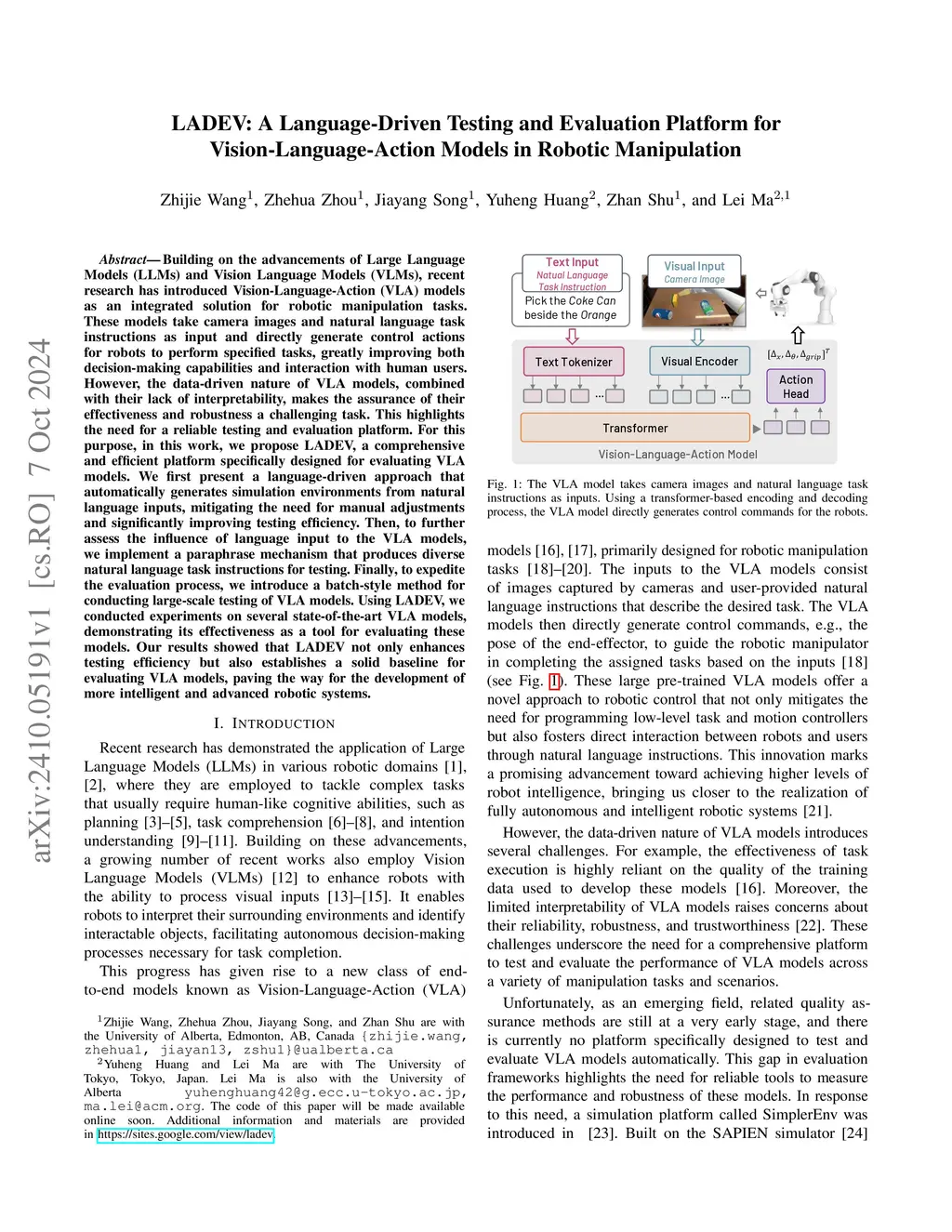 Building on the advancements of Large Language Models (LLMs) and Vision Language Models (VLMs), recent research has introduced Vision-Language-Action (VLA) models as an integrated solution for robotic manipulation tasks. These models take camera images and natural language task instructions as input and directly generate control actions for robots to perform specified tasks, greatly improving both decision-making capabilities and interaction with human users. However, the data-driven nature of VLA models, combined with their lack of interpretability, makes the assurance of their effectiveness and robustness a challenging task. This highlights the need for a reliable testing and evaluation platform. For this purpose, in this work, we propose LADEV, a comprehensive and efficient platform specifically designed for evaluating VLA models. We first present a language-driven approach that automatically generates simulation environments from natural language inputs, mitigating the need for manual adjustments and significantly improving testing efficiency. Then, to further assess the influence of language input on the VLA models, we implement a paraphrase mechanism that produces diverse natural language task instructions for testing. Finally, to expedite the evaluation process, we introduce a batch-style method for conducting large-scale testing of VLA models. Using LADEV, we conducted experiments on several state-of-the-art VLA models, demonstrating its effectiveness as a tool for evaluating these models. Our results showed that LADEV not only enhances testing efficiency but also establishes a solid baseline for evaluating VLA models, paving the way for the development of more intelligent and advanced robotic systems.