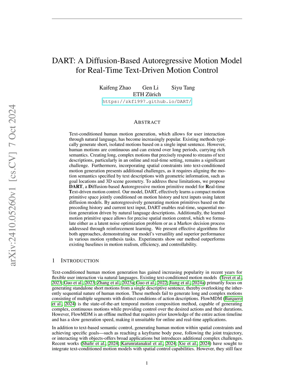 Text-conditioned human motion generation, which allows for user interaction through natural language, has become increasingly popular. Existing methods typically generate short, isolated motions based on a single input sentence. However, human motions are continuous and can extend over long periods, carrying rich semantics. Creating long, complex motions that precisely respond to streams of text descriptions, particularly in an online and real-time setting, remains a significant challenge. Furthermore, incorporating spatial constraints into text-conditioned motion generation presents additional challenges, as it requires aligning the motion semantics specified by text descriptions with geometric information, such as goal locations and 3D scene geometry. To address these limitations, we propose DartControl, in short DART, a Diffusion-based Autoregressive motion primitive model for Real-time Text-driven motion control. Our model effectively learns a compact motion primitive space jointly conditioned on motion history and text inputs using latent diffusion models. By autoregressively generating motion primitives based on the preceding history and current text input, DART enables real-time, sequential motion generation driven by natural language descriptions. Additionally, the learned motion primitive space allows for precise spatial motion control, which we formulate either as a latent noise optimization problem or as a Markov decision process addressed through reinforcement learning. We present effective algorithms for both approaches, demonstrating our model's versatility and superior performance in various motion synthesis tasks. Experiments show our method outperforms existing baselines in motion realism, efficiency, and controllability. Video results are available on the project page:this https URL.