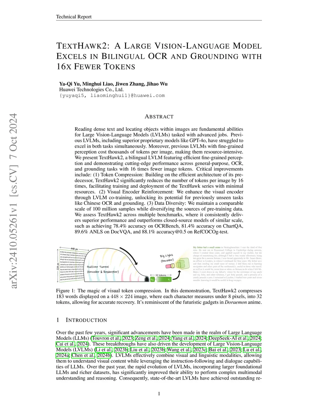 Reading dense text and locating objects within images are fundamental abilities for Large Vision-Language Models (LVLMs) tasked with advanced jobs. Previous LVLMs, including superior proprietary models like GPT-4o, have struggled to excel in both tasks simultaneously. Moreover, previous LVLMs with fine-grained perception cost thousands of tokens per image, making them resource-intensive. We present TextHawk2, a bilingual LVLM featuring efficient fine-grained perception and demonstrating cutting-edge performance across general-purpose, OCR, and grounding tasks with 16 times fewer image tokens. Critical improvements include: (1) Token Compression: Building on the efficient architecture of its predecessor, TextHawk2 significantly reduces the number of tokens per image by 16 times, facilitating training and deployment of the TextHawk series with minimal resources. (2) Visual Encoder Reinforcement: We enhance the visual encoder through LVLM co-training, unlocking its potential for previously unseen tasks like Chinese OCR and grounding. (3) Data Diversity: We maintain a comparable scale of 100 million samples while diversifying the sources of pre-training data. We assess TextHawk2 across multiple benchmarks, where it consistently delivers superior performance and outperforms closed-source models of similar scale, such as achieving 78.4% accuracy on OCRBench, 81.4% accuracy on ChartQA, 89.6% ANLS on DocVQA, and 88.1% accuracy@0.5 on RefCOCOg-test.