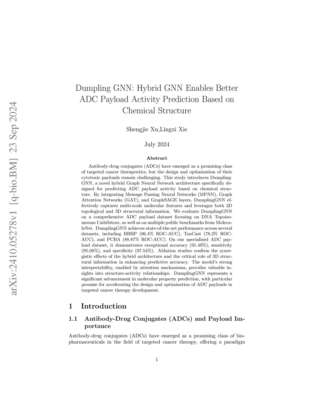 Antibody-drug conjugates (ADCs) have emerged as a promising class of targeted cancer therapeutics, but the design and optimization of their cytotoxic payloads remain challenging. This study introduces DumplingGNN, a novel hybrid Graph Neural Network architecture specifically designed for predicting ADC payload activity based on chemical structure. By integrating Message Passing Neural Networks (MPNN), Graph Attention Networks (GAT), and GraphSAGE layers, DumplingGNN effectively captures multi-scale molecular features and leverages both 2D topological and 3D structural information. We evaluate DumplingGNN on a comprehensive ADC payload dataset focusing on DNA Topoisomerase I inhibitors, as well as on multiple public benchmarks from MoleculeNet. DumplingGNN achieves state-of-the-art performance across several datasets, including BBBP (96.4\% ROC-AUC), ToxCast (78.2\% ROC-AUC), and PCBA (88.87\% ROC-AUC). On our specialized ADC payload dataset, it demonstrates exceptional accuracy (91.48\%), sensitivity (95.08\%), and specificity (97.54\%). Ablation studies confirm the synergistic effects of the hybrid architecture and the critical role of 3D structural information in enhancing predictive accuracy. The model's strong interpretability, enabled by attention mechanisms, provides valuable insights into structure-activity relationships. DumplingGNN represents a significant advancement in molecular property prediction, with particular promise for accelerating the design and optimization of ADC payloads in targeted cancer therapy development.