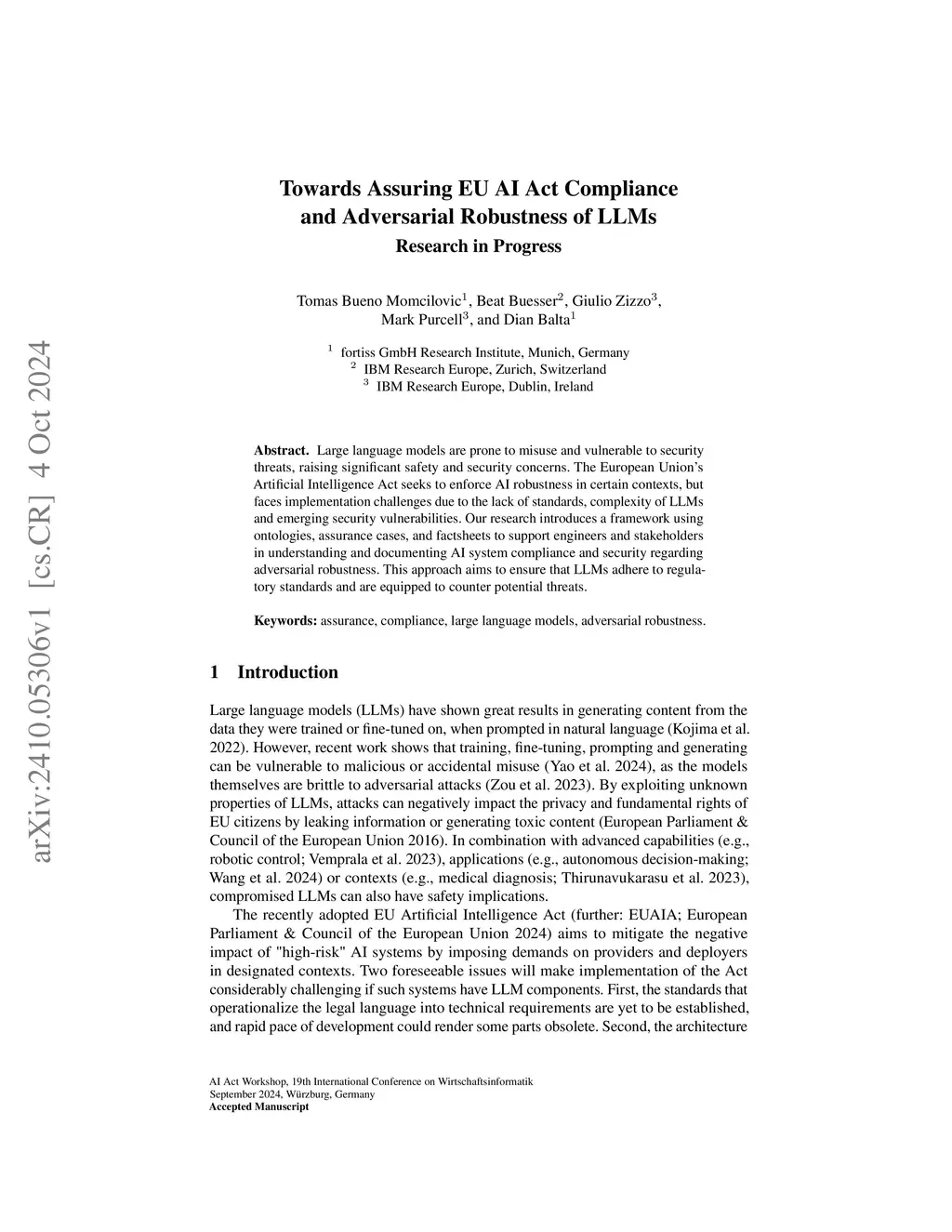 Large language models are prone to misuse and vulnerable to security threats, raising significant safety and security concerns. The European Union's Artificial Intelligence Act seeks to enforce AI robustness in certain contexts, but faces implementation challenges due to the lack of standards, complexity of LLMs and emerging security vulnerabilities. Our research introduces a framework using ontologies, assurance cases, and factsheets to support engineers and stakeholders in understanding and documenting AI system compliance and security regarding adversarial robustness. This approach aims to ensure that LLMs adhere to regulatory standards and are equipped to counter potential threats.