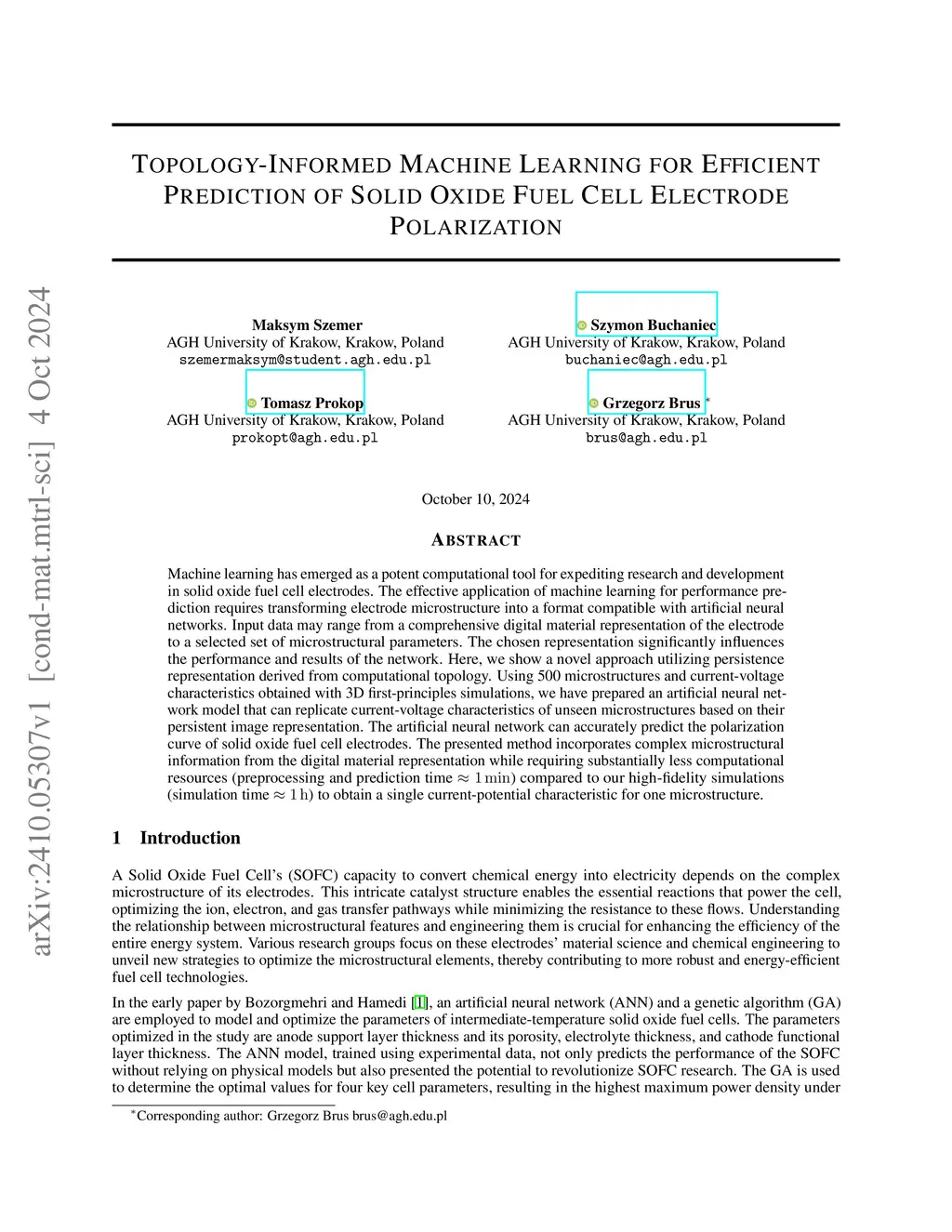 Machine learning has emerged as a potent computational tool for expediting research and development in solid oxide fuel cell electrodes. The effective application of machine learning for performance prediction requires transforming electrode microstructure into a format compatible with artificial neural networks. Input data may range from a comprehensive digital material representation of the electrode to a selected set of microstructural parameters. The chosen representation significantly influences the performance and results of the network. Here, we show a novel approach utilizing persistence representation derived from computational topology. Using 500 microstructures and current-voltage characteristics obtained with 3D first-principles simulations, we have prepared an artificial neural network model that can replicate current-voltage characteristics of unseen microstructures based on their persistent image representation. The artificial neural network can accurately predict the polarization curve of solid oxide fuel cell electrodes. The presented method incorporates complex microstructural information from the digital material representation while requiring substantially less computational resources (preprocessing and prediction time approximately 1 min) compared to our high-fidelity simulations (simulation time approximately 1 hour) to obtain a single current-potential characteristic for one microstructure.