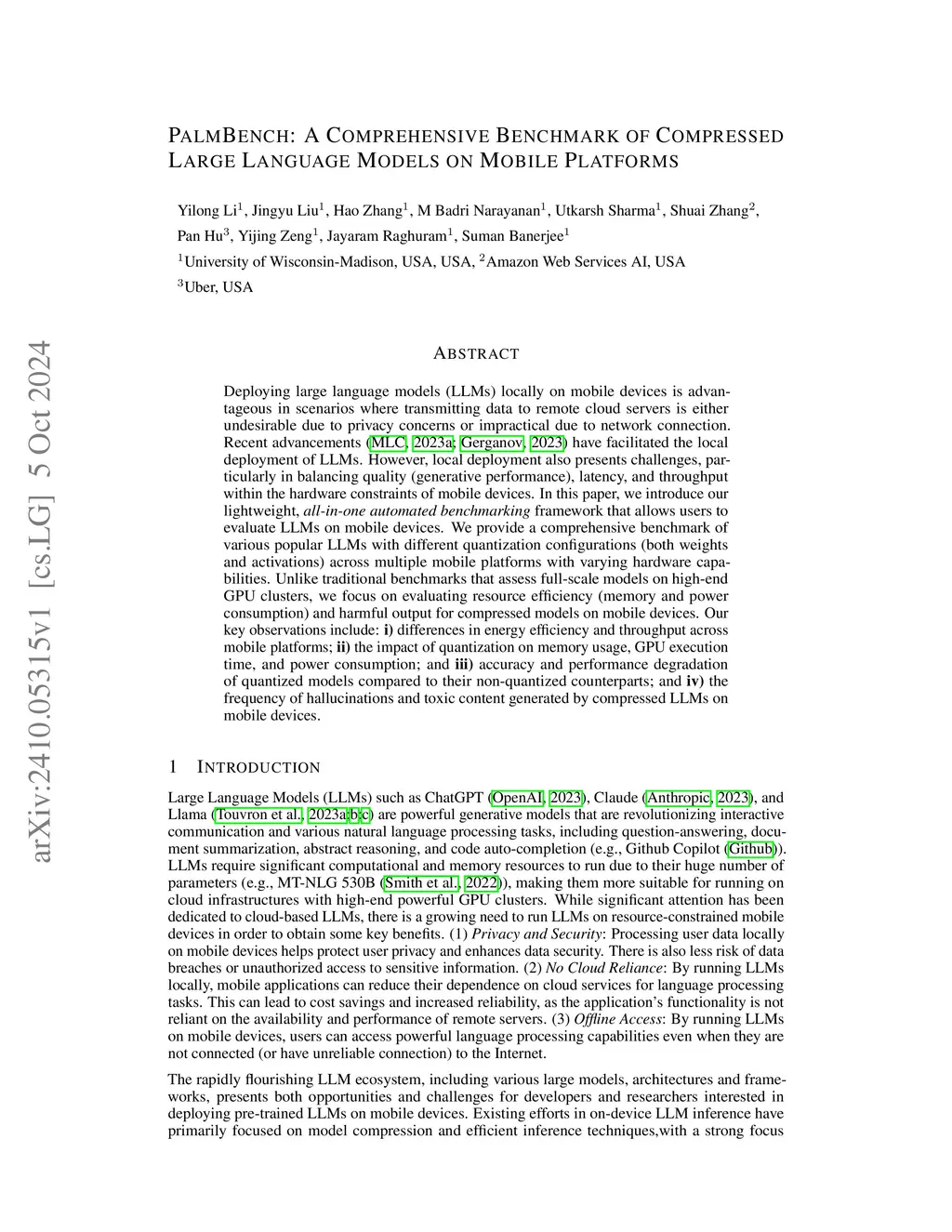 Deploying large language models (LLMs) locally on mobile devices is advantageous in scenarios where transmitting data to remote cloud servers is either undesirable due to privacy concerns or impractical due to network connection. Recent advancements (MLC, 2023a; Gerganov, 2023) have facilitated the local deployment of LLMs. However, local deployment also presents challenges, particularly in balancing quality (generative performance), latency, and throughput within the hardware constraints of mobile devices. In this paper, we introduce our lightweight, all-in-one automated benchmarking framework that allows users to evaluate LLMs on mobile devices. We provide a comprehensive benchmark of various popular LLMs with different quantization configurations (both weights and activations) across multiple mobile platforms with varying hardware capabilities. Unlike traditional benchmarks that assess full-scale models on high-end GPU clusters, we focus on evaluating resource efficiency (memory and power consumption) and harmful output for compressed models on mobile devices. Our key observations include i) differences in energy efficiency and throughput across mobile platforms; ii) the impact of quantization on memory usage, GPU execution time, and power consumption; and iii) accuracy and performance degradation of quantized models compared to their non-quantized counterparts; and iv) the frequency of hallucinations and toxic content generated by compressed LLMs on mobile devices.
