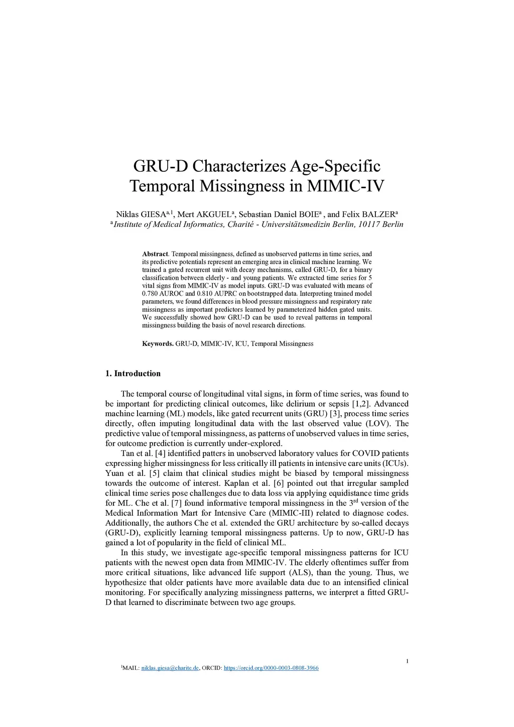 Temporal missingness, defined as unobserved patterns in time series, and its predictive potentials represent an emerging area in clinical machine learning. We trained a gated recurrent unit with decay mechanisms, called GRU-D, for a binary classification between elderly - and young patients. We extracted time series for 5 vital signs from MIMIC-IV as model inputs. GRU-D was evaluated with means of 0.780 AUROC and 0.810 AUPRC on bootstrapped data. Interpreting trained model parameters, we found differences in blood pressure missingness and respiratory rate missingness as important predictors learned by parameterized hidden gated units. We successfully showed how GRU-D can be used to reveal patterns in temporal missingness building the basis of novel research directions.