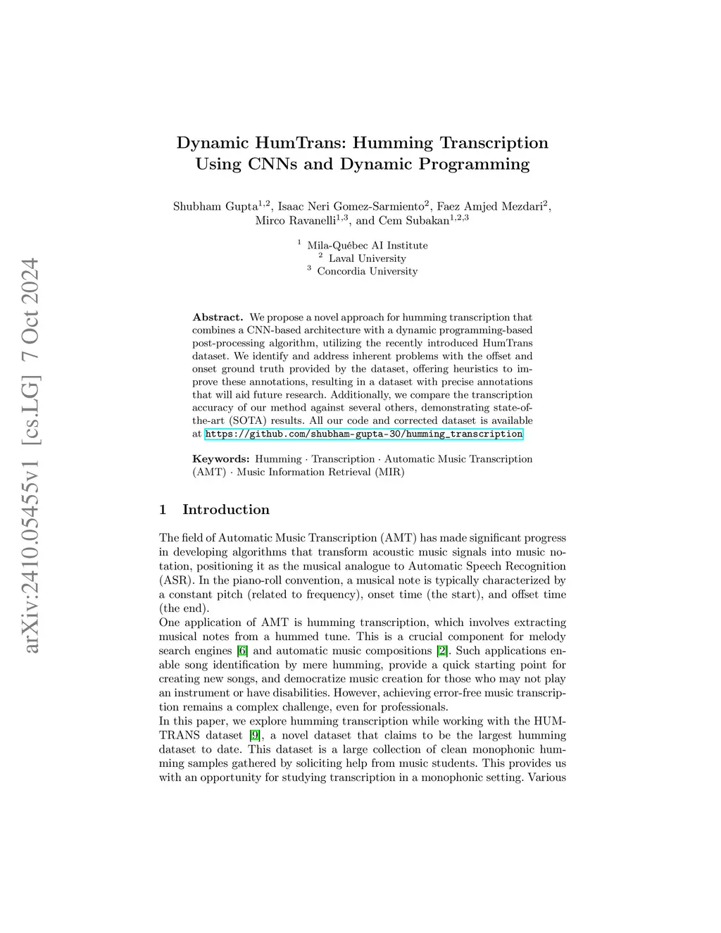 We propose a novel approach for humming transcription that combines a CNN-based architecture with a dynamic programming-based post-processing algorithm, utilizing the recently introduced HumTrans dataset. We identify and address inherent problems with the offset and onset ground truth provided by the dataset, offering heuristics to improve these annotations, resulting in a dataset with precise annotations that will aid future research. Additionally, we compare the transcription accuracy of our method against several others, demonstrating state-of-the-art (SOTA) results. All our code and corrected dataset is available at https://github.com/shubham-gupta-30/humming_transcription