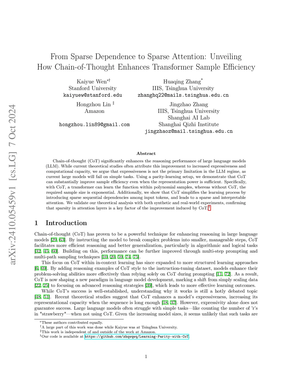 Chain-of-thought (CoT) significantly enhances the reasoning performance of large language models (LLM). While current theoretical studies often attribute this improvement to increased expressiveness and computational capacity, we argue that expressiveness is not the primary limitation in the LLM regime, as current large models will fail on simple tasks. Using a parity-learning setup, we demonstrate that CoT can substantially improve sample efficiency even when the representation power is sufficient. Specifically, with CoT, a transformer can learn the function within polynomial samples, whereas without CoT, the required sample size is exponential. Additionally, we show that CoT simplifies the learning process by introducing sparse sequential dependencies among input tokens, and leads to a sparse and interpretable attention. We validate our theoretical analysis with both synthetic and real-world experiments, confirming that sparsity in attention layers is a key factor of the improvement induced by CoT.