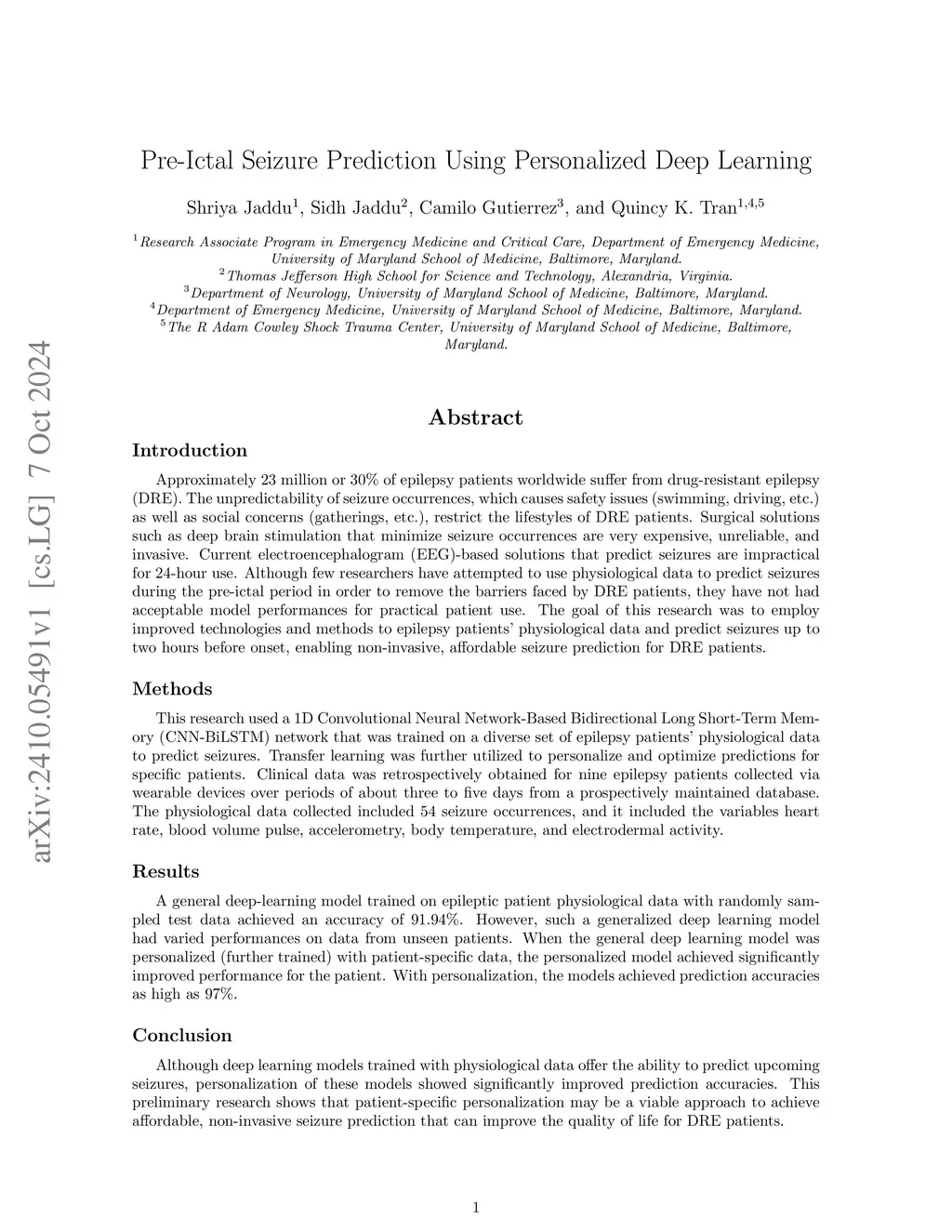 Introduction: Approximately 23 million or 30% of epilepsy patients worldwide suffer from drug-resistant epilepsy (DRE). The unpredictability of seizure occurrences, which causes safety issues as well as social concerns, restrict the lifestyles of DRE patients. Surgical solutions and EEG-based solutions are very expensive, unreliable, invasive or impractical. The goal of this research was to employ improved technologies and methods to epilepsy patient physiological data and predict seizures up to two hours before onset, enabling non-invasive, affordable seizure prediction for DRE patients. Methods: This research used a 1D Convolutional Neural Network-Based Bidirectional Long Short-Term Memory network that was trained on a diverse set of epileptic patient physiological data to predict seizures. Transfer learning was further utilized to personalize and optimize predictions for specific patients. Clinical data was retrospectively obtained for nine epilepsy patients via wearable devices over a period of about three to five days from a prospectively maintained database. The physiological data included 54 seizure occurrences and included heart rate, blood volume pulse, accelerometry, body temperature, and electrodermal activity. Results and Conclusion: A general deep-learning model trained on the physiological data with randomly sampled test data achieved an accuracy of 91.94%. However, such a generalized deep learning model had varied performances on data from unseen patients. When the general model was personalized (further trained) with patient-specific data, the personalized model achieved significantly improved performance with accuracies as high as 97%. This preliminary research shows that patient-specific personalization may be a viable approach to achieve affordable, non-invasive seizure prediction that can improve the quality of life for DRE patients.