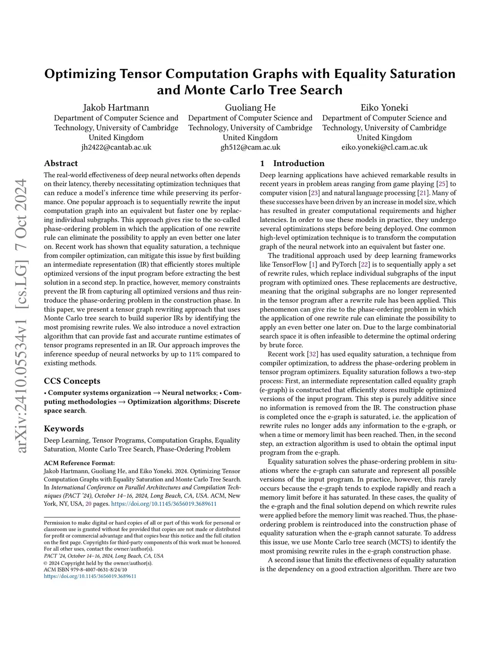 The real-world effectiveness of deep neural networks often depends on their latency, thereby necessitating optimization techniques that can reduce a model's inference time while preserving its performance. One popular approach is to sequentially rewrite the input computation graph into an equivalent but faster one by replacing individual subgraphs. This approach gives rise to the so-called phase-ordering problem in which the application of one rewrite rule can eliminate the possibility to apply an even better one later on. Recent work has shown that equality saturation, a technique from compiler optimization, can mitigate this issue by first building an intermediate representation (IR) that efficiently stores multiple optimized versions of the input program before extracting the best solution in a second step. In practice, however, memory constraints prevent the IR from capturing all optimized versions and thus reintroduce the phase-ordering problem in the construction phase. In this paper, we present a tensor graph rewriting approach that uses Monte Carlo tree search to build superior IRs by identifying the most promising rewrite rules. We also introduce a novel extraction algorithm that can provide fast and accurate runtime estimates of tensor programs represented in an IR. Our approach improves the inference speedup of neural networks by up to 11% compared to existing methods.