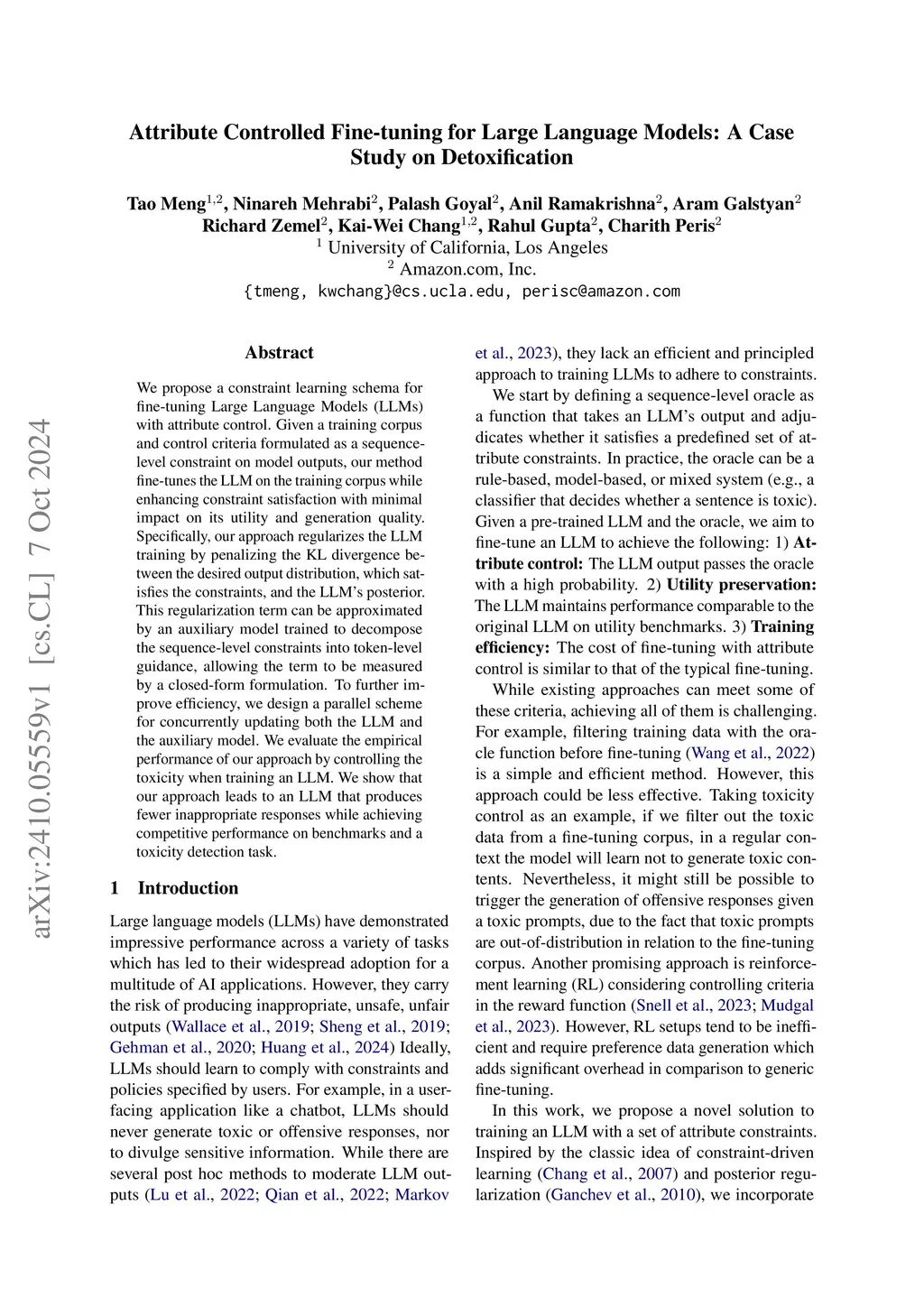 We propose a constraint learning schema for fine-tuning Large Language Models (LLMs) with attribute control. Given a training corpus and control criteria formulated as a sequence-level constraint on model outputs, our method fine-tunes the LLM on the training corpus while enhancing constraint satisfaction with minimal impact on its utility and generation quality. Specifically, our approach regularizes the LLM training by penalizing the KL divergence between the desired output distribution, which satisfies the constraints, and the LLM's posterior. This regularization term can be approximated by an auxiliary model trained to decompose the sequence-level constraints into token-level guidance, allowing the term to be measured by a closed-form formulation. To further improve efficiency, we design a parallel scheme for concurrently updating both the LLM and the auxiliary model. We evaluate the empirical performance of our approach by controlling the toxicity when training an LLM. We show that our approach leads to an LLM that produces fewer inappropriate responses while achieving competitive performance on benchmarks and a toxicity detection task.