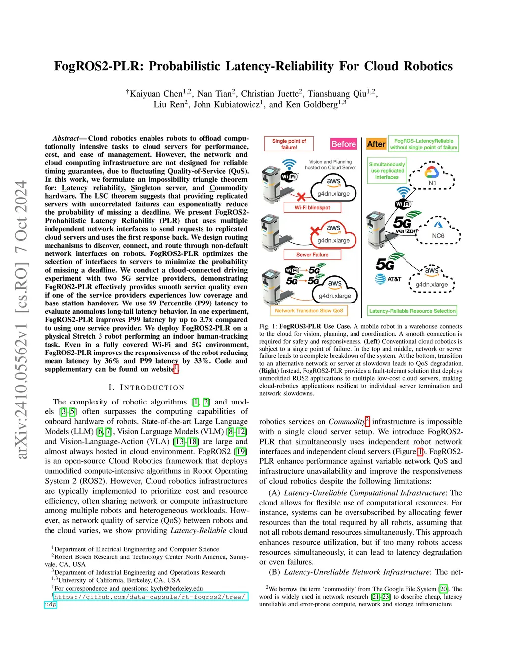 Cloud robotics enables robots to offload computationally intensive tasks to cloud servers for performance, cost, and ease of management. However, the network and cloud computing infrastructure are not designed for reliable timing guarantees, due to fluctuating Quality-of-Service (QoS). In this work, we formulate an impossibility triangle theorem for: Latency reliability, Singleton server, and Commodity hardware. The LSC theorem suggests that providing replicated servers with uncorrelated failures can exponentially reduce the probability of missing a deadline. We present FogROS2-Probabilistic Latency Reliability (PLR) that uses multiple independent network interfaces to send requests to replicated cloud servers and uses the first response back. We design routing mechanisms to discover, connect, and route through non-default network interfaces on robots. FogROS2-PLR optimizes the selection of interfaces to servers to minimize the probability of missing a deadline. We conduct a cloud-connected driving experiment with two 5G service providers, demonstrating FogROS2-PLR effectively provides smooth service quality even if one of the service providers experiences low coverage and base station handover. We use 99 Percentile (P99) latency to evaluate anomalous long-tail latency behavior. In one experiment, FogROS2-PLR improves P99 latency by up to 3.7x compared to using one service provider. We deploy FogROS2-PLR on a physical Stretch 3 robot performing an indoor human-tracking task. Even in a fully covered Wi-Fi and 5G environment, FogROS2-PLR improves the responsiveness of the robot reducing mean latency by 36% and P99 latency by 33%.