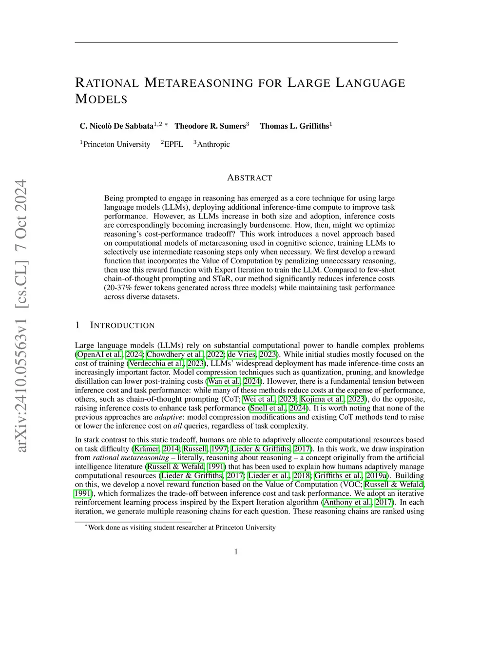 Being prompted to engage in reasoning has emerged as a core technique for using large language models (LLMs), deploying additional inference-time compute to improve task performance. However, as LLMs increase in both size and adoption, inference costs are correspondingly becoming increasingly burdensome. How, then, might we optimize reasoning's cost-performance tradeoff? This work introduces a novel approach based on computational models of metareasoning used in cognitive science, training LLMs to selectively use intermediate reasoning steps only when necessary. We first develop a reward function that incorporates the Value of Computation by penalizing unnecessary reasoning, then use this reward function with Expert Iteration to train the LLM. Compared to few-shot chain-of-thought prompting and STaR, our method significantly reduces inference costs (20-37\% fewer tokens generated across three models) while maintaining task performance across diverse datasets.