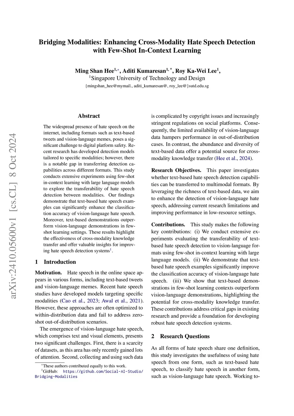 The widespread presence of hate speech on the internet, including formats such as text-based tweets and vision-language memes, poses a significant challenge to digital platform safety. Recent research has developed detection models tailored to specific modalities; however, there is a notable gap in transferring detection capabilities across different formats. This study conducts extensive experiments using few-shot in-context learning with large language models to explore the transferability of hate speech detection between modalities. Our findings demonstrate that text-based hate speech examples can significantly enhance the classification accuracy of vision-language hate speech. Moreover, text-based demonstrations outperform vision-language demonstrations in few-shot learning settings. These results highlight the effectiveness of cross-modality knowledge transfer and offer valuable insights for improving hate speech detection systems.