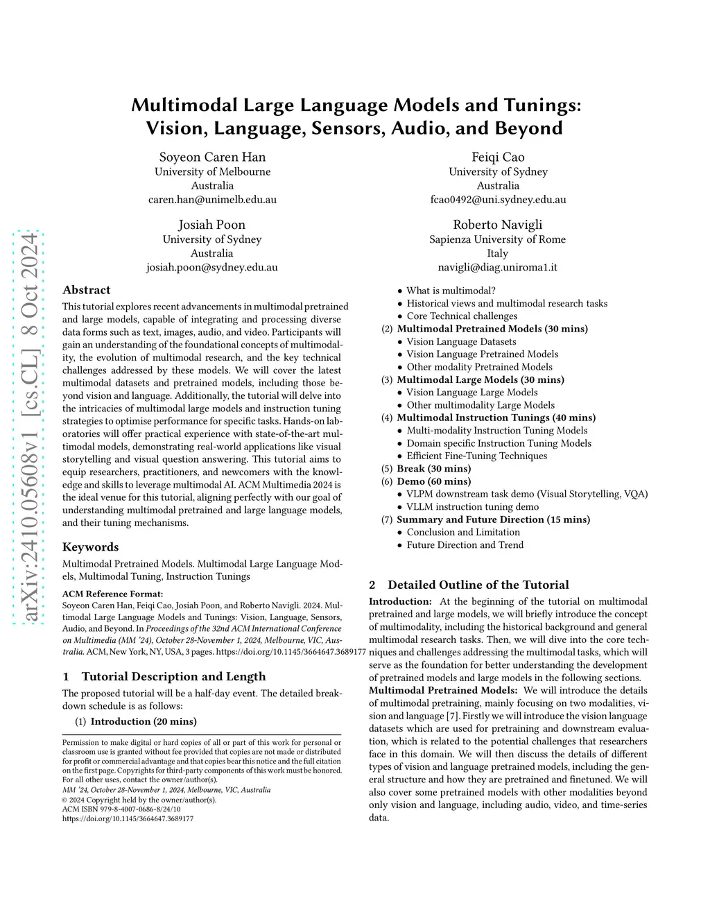 This tutorial explores recent advancements in multimodal pretrained and large models, capable of integrating and processing diverse data forms such as text, images, audio, and video. Participants will gain an understanding of the foundational concepts of multimodality, the evolution of multimodal research, and the key technical challenges addressed by these models. We will cover the latest multimodal datasets and pretrained models, including those beyond vision and language. Additionally, the tutorial will delve into the intricacies of multimodal large models and instruction tuning strategies to optimise performance for specific tasks. Hands-on laboratories will offer practical experience with state-of-the-art multimodal models, demonstrating real-world applications like visual storytelling and visual question answering. This tutorial aims to equip researchers, practitioners, and newcomers with the knowledge and skills to leverage multimodal AI. ACM Multimedia 2024 is the ideal venue for this tutorial, aligning perfectly with our goal of understanding multimodal pretrained and large language models, and their tuning mechanisms.