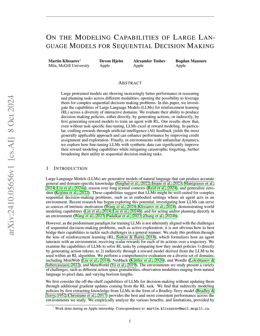 Large pretrained models are showing increasingly better performance in reasoning and planning tasks across different modalities, opening the possibility to leverage them for complex sequential decision making problems. In this paper, we investigate the capabilities of Large Language Models (LLMs) for reinforcement learning (RL) across a diversity of interactive domains. We evaluate their ability to produce decision-making policies, either directly, by generating actions, or indirectly, by first generating reward models to train an agent with RL. Our results show that, even without task-specific fine-tuning, LLMs excel at reward modeling. In particular, crafting rewards through artificial intelligence (AI) feedback yields the most generally applicable approach and can enhance performance by improving credit assignment and exploration. Finally, in environments with unfamiliar dynamics, we explore how fine-tuning LLMs with synthetic data can significantly improve their reward modeling capabilities while mitigating catastrophic forgetting, further broadening their utility in sequential decision-making tasks.