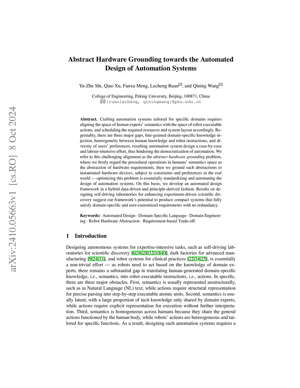 Crafting automation systems tailored for specific domains requires aligning the space of human experts' semantics with the space of robot executable actions, and scheduling the required resources and system layout accordingly. Regrettably, there are three major gaps, fine-grained domain-specific knowledge injection, heterogeneity between human knowledge and robot instructions, and diversity of users' preferences, resulting automation system design a case-by-case and labour-intensive effort, thus hindering the democratization of automation. We refer to this challenging alignment as the abstract hardware grounding problem, where we firstly regard the procedural operations in humans' semantics space as the abstraction of hardware requirements, then we ground such abstractions to instantiated hardware devices, subject to constraints and preferences in the real world -- optimizing this problem is essentially standardizing and automating the design of automation systems. On this basis, we develop an automated design framework in a hybrid data-driven and principle-derived fashion. Results on designing self-driving laboratories for enhancing experiment-driven scientific discovery suggest our framework's potential to produce compact systems that fully satisfy domain-specific and user-customized requirements with no redundancy.