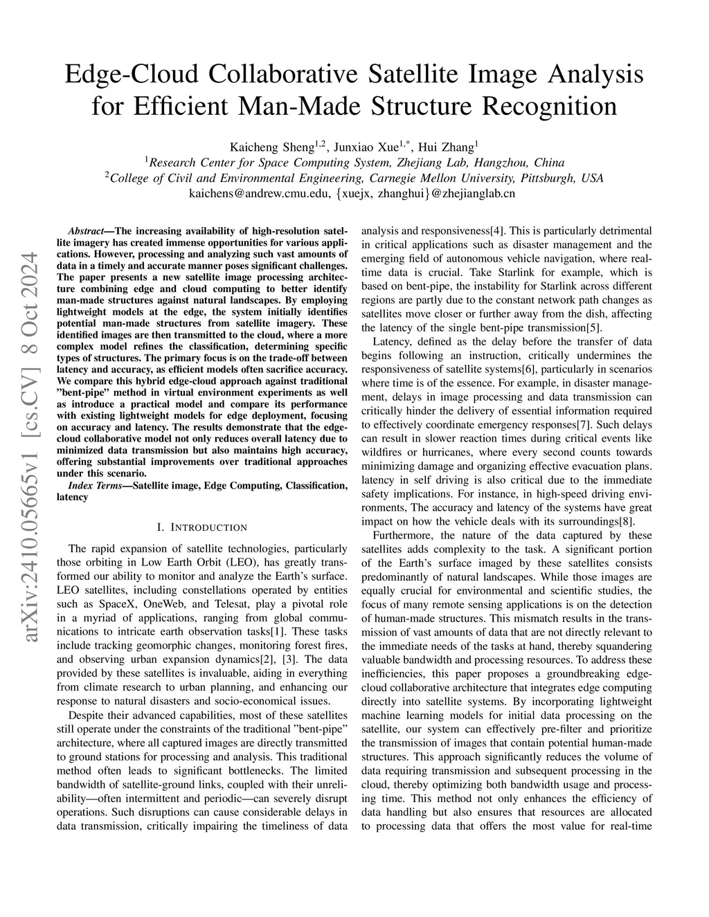 The increasing availability of high-resolution satellite imagery has created immense opportunities for various applications. However, processing and analyzing such vast amounts of data in a timely and accurate manner poses significant challenges. The paper presents a new satellite image processing architecture combining edge and cloud computing to better identify man-made structures against natural landscapes. By employing lightweight models at the edge, the system initially identifies potential man-made structures from satellite imagery. These identified images are then transmitted to the cloud, where a more complex model refines the classification, determining specific types of structures. The primary focus is on the trade-off between latency and accuracy, as efficient models often sacrifice accuracy. We compare this hybrid edge-cloud approach against traditional "bent-pipe" method in virtual environment experiments as well as introduce a practical model and compare its performance with existing lightweight models for edge deployment, focusing on accuracy and latency. The results demonstrate that the edge-cloud collaborative model not only reduces overall latency due to minimized data transmission but also maintains high accuracy, offering substantial improvements over traditional approaches under this scenario.