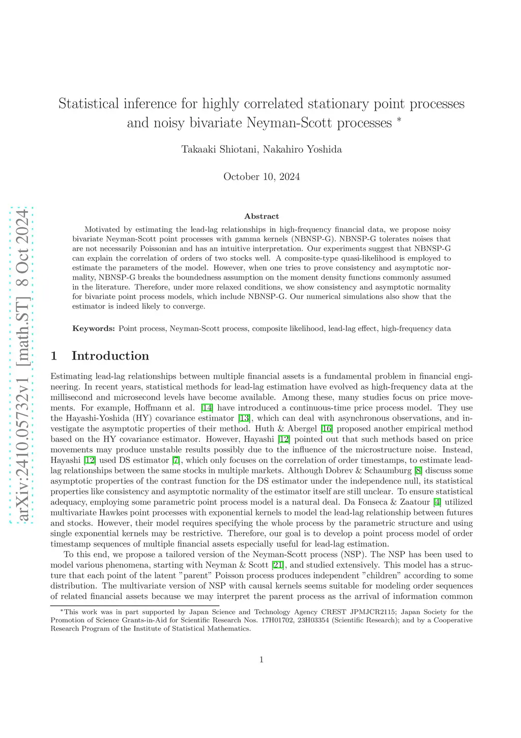 Motivated by estimating the lead-lag relationships in high-frequency financial data, we propose noisy bivariate Neyman-Scott point processes with gamma kernels (NBNSP-G). NBNSP-G tolerates noises that are not necessarily Poissonian and has an intuitive interpretation. Our experiments suggest that NBNSP-G can explain the correlation of orders of two stocks well. A composite-type quasi-likelihood is employed to estimate the parameters of the model. However, when one tries to prove consistency and asymptotic normality, NBNSP-G breaks the boundedness assumption on the moment density functions commonly assumed in the literature. Therefore, under more relaxed conditions, we show consistency and asymptotic normality for bivariate point process models, which include NBNSP-G. Our numerical simulations also show that the estimator is indeed likely to converge.