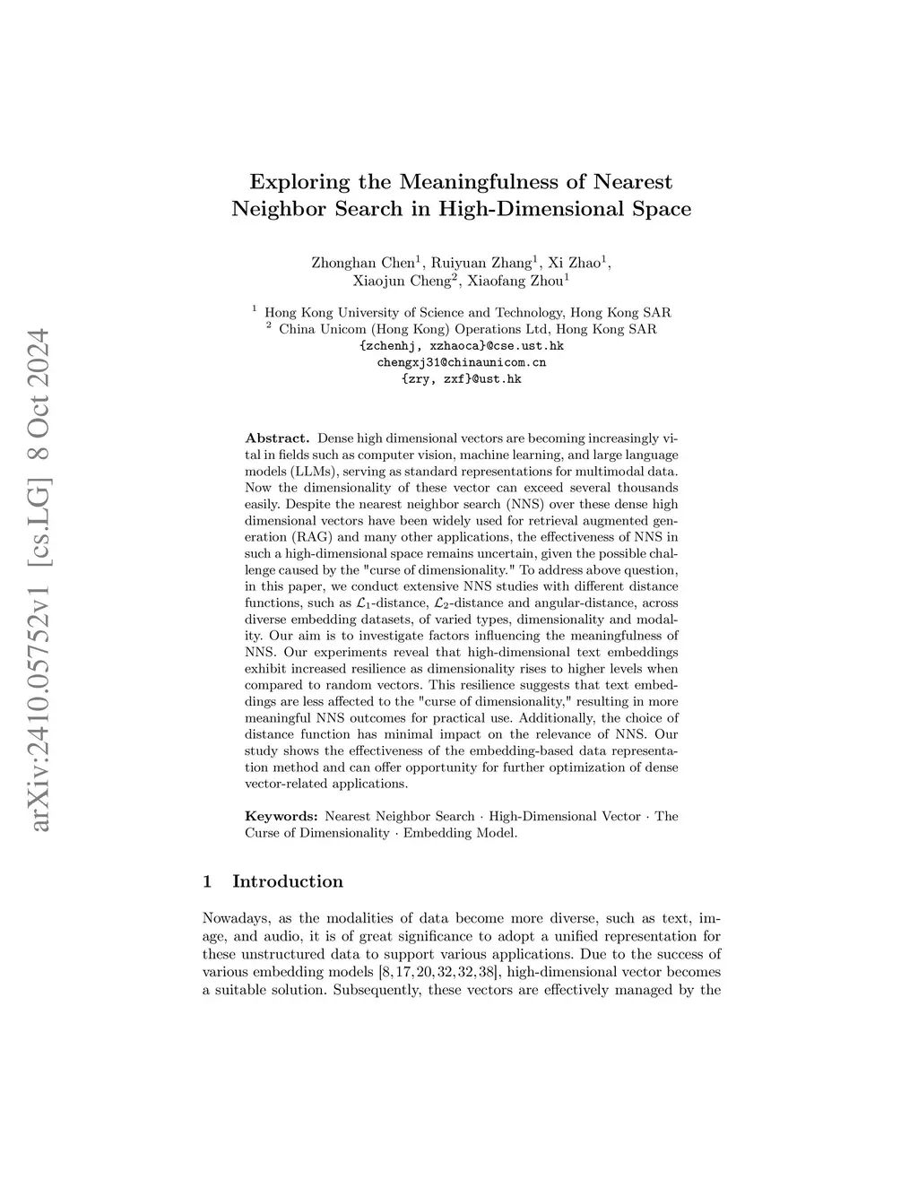 Dense high dimensional vectors are becoming increasingly vital in fields such as computer vision, machine learning, and large language models (LLMs), serving as standard representations for multimodal data. Now the dimensionality of these vector can exceed several thousands easily. Despite the nearest neighbor search (NNS) over these dense high dimensional vectors have been widely used for retrieval augmented generation (RAG) and many other applications, the effectiveness of NNS in such a high-dimensional space remains uncertain, given the possible challenge caused by the "curse of dimensionality." To address above question, in this paper, we conduct extensive NNS studies with different distance functions, such as distance, distance and angular-distance, across diverse embedding datasets, of varied types, dimensionality and modality. Our aim is to investigate factors influencing the meaningfulness of NNS. Our experiments reveal that high-dimensional text embeddings exhibit increased resilience as dimensionality rises to higher levels when compared to random vectors. This resilience suggests that text embeddings are less affected to the "curse of dimensionality," resulting in more meaningful NNS outcomes for practical use. Additionally, the choice of distance function has minimal impact on the relevance of NNS. Our study shows the effectiveness of the embedding-based data representation method and can offer opportunity for further optimization of dense vector-related applications.