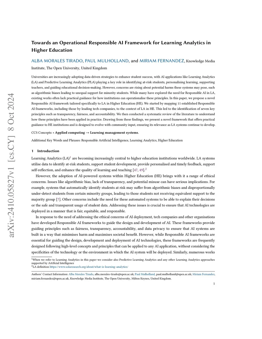 Universities are increasingly adopting data-driven strategies to enhance student success, with AI applications like Learning Analytics (LA) and Predictive Learning Analytics (PLA) playing a key role in identifying at-risk students, personalising learning, supporting teachers, and guiding educational decision-making. However, concerns are rising about potential harms these systems may pose, such as algorithmic biases leading to unequal support for minority students. While many have explored the need for Responsible AI in LA, existing works often lack practical guidance for how institutions can operationalise these principles. In this paper, we propose a novel Responsible AI framework tailored specifically to LA in Higher Education (HE). We started by mapping 11 established Responsible AI frameworks, including those by leading tech companies, to the context of LA in HE. This led to the identification of seven key principles such as transparency, fairness, and accountability. We then conducted a systematic review of the literature to understand how these principles have been applied in practice. Drawing from these findings, we present a novel framework that offers practical guidance to HE institutions and is designed to evolve with community input, ensuring its relevance as LA systems continue to develop.