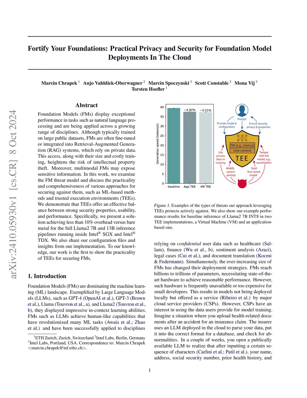 Foundation Models (FMs) display exceptional performance in tasks such as natural language processing and are being applied across a growing range of disciplines. Although typically trained on large public datasets, FMs are often fine-tuned or integrated into Retrieval-Augmented Generation (RAG) systems, which rely on private data. This access, along with their size and costly training, heightens the risk of intellectual property theft. Moreover, multimodal FMs may expose sensitive information. In this work, we examine the FM threat model and discuss the practicality and comprehensiveness of various approaches for securing against them, such as ML-based methods and trusted execution environments (TEEs). We demonstrate that TEEs offer an effective balance between strong security properties, usability, and performance. Specifically, we present a solution achieving less than 10\% overhead versus bare metal for the full Llama2 7B and 13B inference pipelines running inside \intel\ SGX and \intel\ TDX. We also share our configuration files and insights from our implementation. To our knowledge, our work is the first to show the practicality of TEEs for securing FMs.