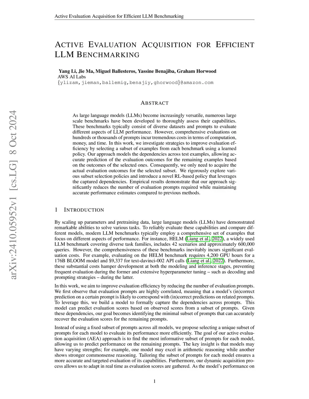 As large language models (LLMs) become increasingly versatile, numerous large scale benchmarks have been developed to thoroughly assess their capabilities. These benchmarks typically consist of diverse datasets and prompts to evaluate different aspects of LLM performance. However, comprehensive evaluations on hundreds or thousands of prompts incur tremendous costs in terms of computation, money, and time. In this work, we investigate strategies to improve evaluation efficiency by selecting a subset of examples from each benchmark using a learned policy. Our approach models the dependencies across test examples, allowing accurate prediction of the evaluation outcomes for the remaining examples based on the outcomes of the selected ones. Consequently, we only need to acquire the actual evaluation outcomes for the selected subset. We rigorously explore various subset selection policies and introduce a novel RL-based policy that leverages the captured dependencies. Empirical results demonstrate that our approach significantly reduces the number of evaluation prompts required while maintaining accurate performance estimates compared to previous methods.