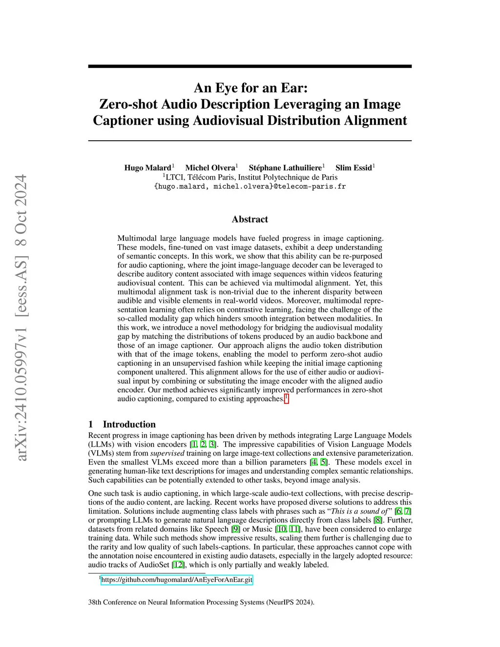 Multimodal large language models have fueled progress in image captioning. These models, fine-tuned on vast image datasets, exhibit a deep understanding of semantic concepts. In this work, we show that this ability can be re-purposed for audio captioning, where the joint image-language decoder can be leveraged to describe auditory content associated with image sequences within videos featuring audiovisual content. This can be achieved via multimodal alignment. Yet, this multimodal alignment task is non-trivial due to the inherent disparity between audible and visible elements in real-world videos. Moreover, multimodal representation learning often relies on contrastive learning, facing the challenge of the so-called modality gap which hinders smooth integration between modalities. In this work, we introduce a novel methodology for bridging the audiovisual modality gap by matching the distributions of tokens produced by an audio backbone and those of an image captioner. Our approach aligns the audio token distribution with that of the image tokens, enabling the model to perform zero-shot audio captioning in an unsupervised fashion while keeping the initial image captioning component unaltered. This alignment allows for the use of either audio or audiovisual input by combining or substituting the image encoder with the aligned audio encoder. Our method achieves significantly improved performances in zero-shot audio captioning, compared to existing approaches.