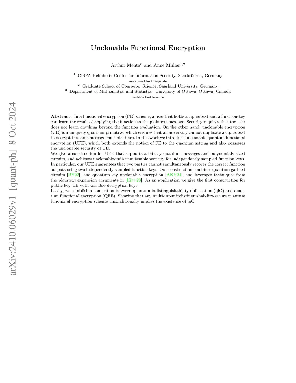In a functional encryption (FE) scheme, a user that holds a ciphertext and a function key can learn the result of applying the function to the plaintext message. Security requires that the user does not learn anything beyond the function evaluation. We extend this notion to the quantum setting by providing definitions and a construction for a quantum functional encryption (QFE) scheme which allows for the evaluation of polynomialy-sized circuits on arbitrary quantum messages. Our construction is built upon quantum garbled circuits [BY22]. We also investigate the relationship of QFE to the seemingly unrelated notion of unclonable encryption (UE) and find that any QFE scheme universally achieves the property of unclonable functional encryption (UFE). In particular we assume the existence of an unclonable encryption scheme with quantum decryption keys which was recently constructed by [AKY24]. Our UFE guarantees that two parties cannot simultaneously recover the correct function outputs using two independently sampled function secret keys. As an application we give the first construction for public-key UE with variable decryption keys. Lastly, we establish a connection between quantum indistinguishability obfuscation (qiO) and quantum functional encryption (QFE); Showing that any multi-input indistinguishability-secure quantum functional encryption scheme unconditionally implies the existence of qiO.