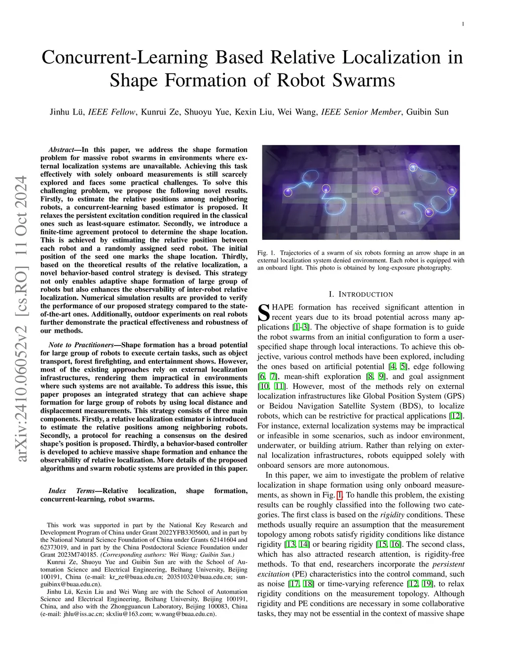 In this paper, we address the shape formation problem for massive robot swarms in environments where external localization systems are unavailable. Achieving this task effectively with solely onboard measurements is still scarcely explored and faces some practical challenges. To solve this challenging problem, we propose the following novel results. Firstly, to estimate the relative positions among neighboring robots, a concurrent-learning based estimator is proposed. It relaxes the persistent excitation condition required in the classical ones such as least-square estimator. Secondly, we introduce a finite-time agreement protocol to determine the shape location. This is achieved by estimating the relative position between each robot and a randomly assigned seed robot. The initial position of the seed one marks the shape location. Thirdly, based on the theoretical results of the relative localization, a novel behavior-based control strategy is devised. This strategy not only enables adaptive shape formation of large group of robots but also enhances the observability of inter-robot relative localization. Numerical simulation results are provided to verify the performance of our proposed strategy compared to the state-of-the-art ones. Additionally, outdoor experiments on real robots further demonstrate the practical effectiveness and robustness of our methods.