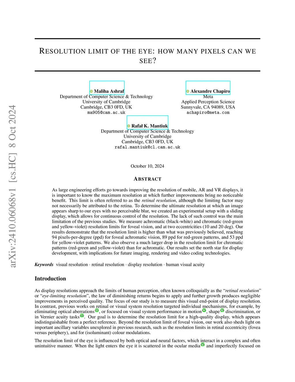 As large engineering efforts go towards improving the resolution of mobile, AR and VR displays, it is important to know the maximum resolution at which further improvements bring no noticeable benefit. This limit is often referred to as the "retinal resolution", although the limiting factor may not necessarily be attributed to the retina. To determine the ultimate resolution at which an image appears sharp to our eyes with no perceivable blur, we created an experimental setup with a sliding display, which allows for continuous control of the resolution. The lack of such control was the main limitation of the previous studies. We measure achromatic (black-white) and chromatic (red-green and yellow-violet) resolution limits for foveal vision, and at two eccentricities (10 and 20 deg). Our results demonstrate that the resolution limit is higher than what was previously believed, reaching 94 pixels-per-degree (ppd) for foveal achromatic vision, 89 ppd for red-green patterns, and 53 ppd for yellow-violet patterns. We also observe a much larger drop in the resolution limit for chromatic patterns (red-green and yellow-violet) than for achromatic. Our results set the north star for display development, with implications for future imaging, rendering and video coding technologies.