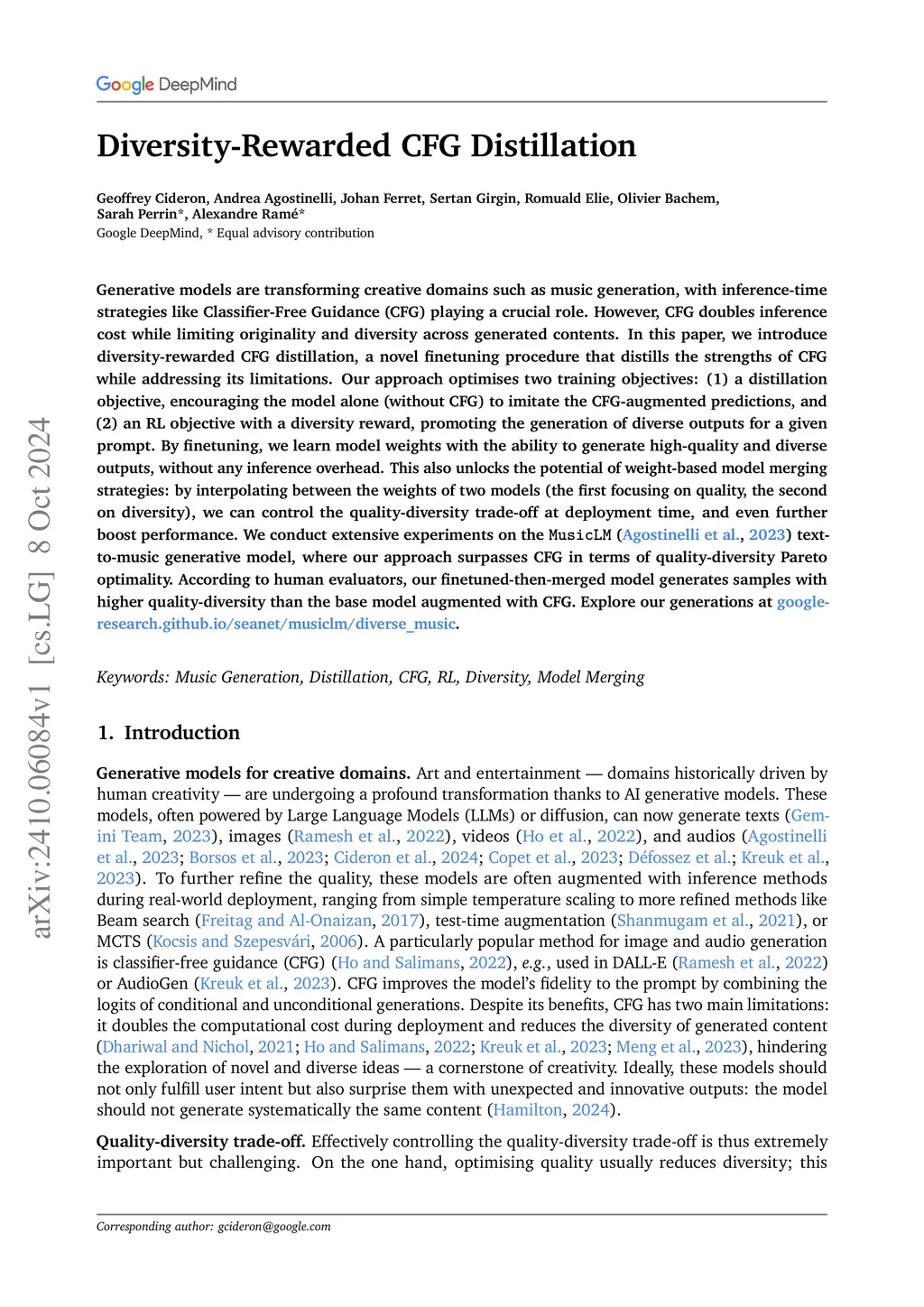Generative models are transforming creative domains such as music generation, with inference-time strategies like Classifier-Free Guidance (CFG) playing a crucial role. However, CFG doubles inference cost while limiting originality and diversity across generated contents. In this paper, we introduce diversity-rewarded CFG distillation, a novel finetuning procedure that distills the strengths of CFG while addressing its limitations. Our approach optimises two training objectives: (1) a distillation objective, encouraging the model alone (without CFG) to imitate the CFG-augmented predictions, and (2) an RL objective with a diversity reward, promoting the generation of diverse outputs for a given prompt. By finetuning, we learn model weights with the ability to generate high-quality and diverse outputs, without any inference overhead. This also unlocks the potential of weight-based model merging strategies: by interpolating between the weights of two models (the first focusing on quality, the second on diversity), we can control the quality-diversity trade-off at deployment time, and even further boost performance. We conduct extensive experiments on the MusicLM (Agostinelli et al., 2023) text-to-music generative model, where our approach surpasses CFG in terms of quality-diversity Pareto optimality. According to human evaluators, our finetuned-then-merged model generates samples with higher quality-diversity than the base model augmented with CFG. Explore our generations at https://google-research.github.io/seanet/musiclm/diverse_music/.