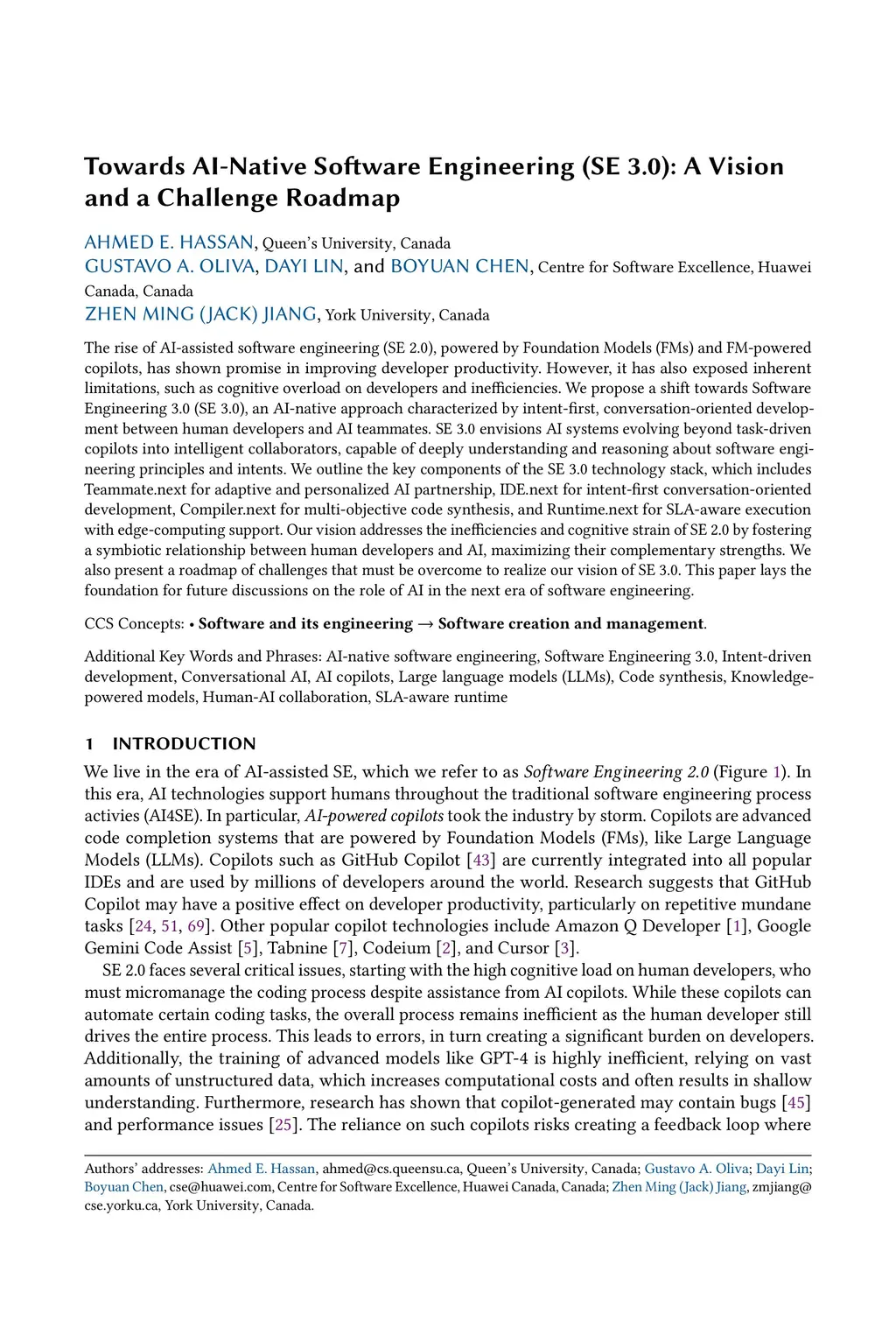 The rise of AI-assisted software engineering (SE 2.0), powered by Foundation Models (FMs) and FM-powered coding assistants, has shown promise in improving developer productivity. However, it has also exposed inherent limitations, such as cognitive overload on developers and inefficiencies. We propose a shift towards Software Engineering 3.0 (SE 3.0), an AI-native approach characterized by intent-centric, conversation-oriented development between human developers and AI teammates. SE 3.0 envisions AI systems evolving beyond task-driven copilots into intelligent collaborators, capable of deeply understanding and reasoning about software engineering principles and intents. We outline the key components of the SE 3.0 technology stack, which includesthis http URLfor adaptive and personalized AI partnership,this http URLfor intent-centric conversation-oriented development,this http URLfor multi-objective code synthesis, andthis http URLfor SLA-aware execution with edge-computing support. Our vision addresses the inefficiencies and cognitive strain of SE 2.0 by fostering a symbiotic relationship between human developers and AI, maximizing their complementary strengths. We also present a roadmap of challenges that must be overcome to realize our vision of SE 3.0. This paper lays the foundation for future discussions on the role of AI in the next era of software engineering.