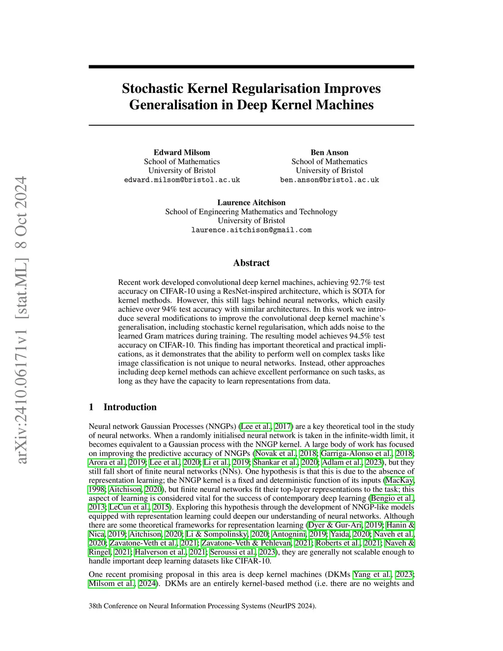 Recent work developed convolutional deep kernel machines, achieving 92.7% test accuracy on CIFAR-10 using a ResNet-inspired architecture, which is SOTA for kernel methods. However, this still lags behind neural networks, which easily achieve over 94% test accuracy with similar architectures. In this work we introduce several modifications to improve the convolutional deep kernel machine's generalisation, including stochastic kernel regularisation, which adds noise to the learned Gram matrices during training. The resulting model achieves 94.5% test accuracy on CIFAR-10. This finding has important theoretical and practical implications, as it demonstrates that the ability to perform well on complex tasks like image classification is not unique to neural networks. Instead, other approaches including deep kernel methods can achieve excellent performance on such tasks, as long as they have the capacity to learn representations from data.