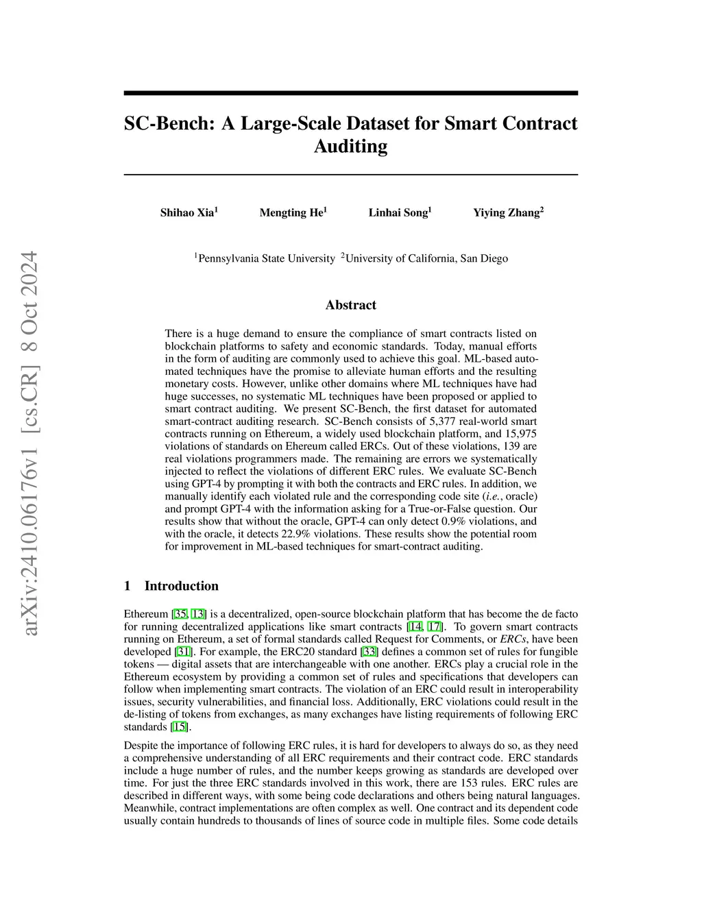 There is a huge demand to ensure the compliance of smart contracts listed on blockchain platforms to safety and economic standards. Today, manual efforts in the form of auditing are commonly used to achieve this goal. ML-based automated techniques have the promise to alleviate human efforts and the resulting monetary costs. However, unlike other domains where ML techniques have had huge successes, no systematic ML techniques have been proposed or applied to smart contract auditing. We present SC-Bench, the first dataset for automated smart-contract auditing research. SC-Bench consists of 5,377 real-world smart contracts running on Ethereum, a widely used blockchain platform, and 15,975 violations of standards on Ehereum called ERCs. Out of these violations, 139 are real violations programmers made. The remaining are errors we systematically injected to reflect the violations of different ERC rules. We evaluate SC-Bench using GPT-4 by prompting it with both the contracts and ERC rules. In addition, we manually identify each violated rule and the corresponding code site (i.e., oracle) and prompt GPT-4 with the information asking for a True-or-False question. Our results show that without the oracle, GPT-4 can only detect 0.9% violations, and with the oracle, it detects 22.9% violations. These results show the potential room for improvement in ML-based techniques for smart-contract auditing.