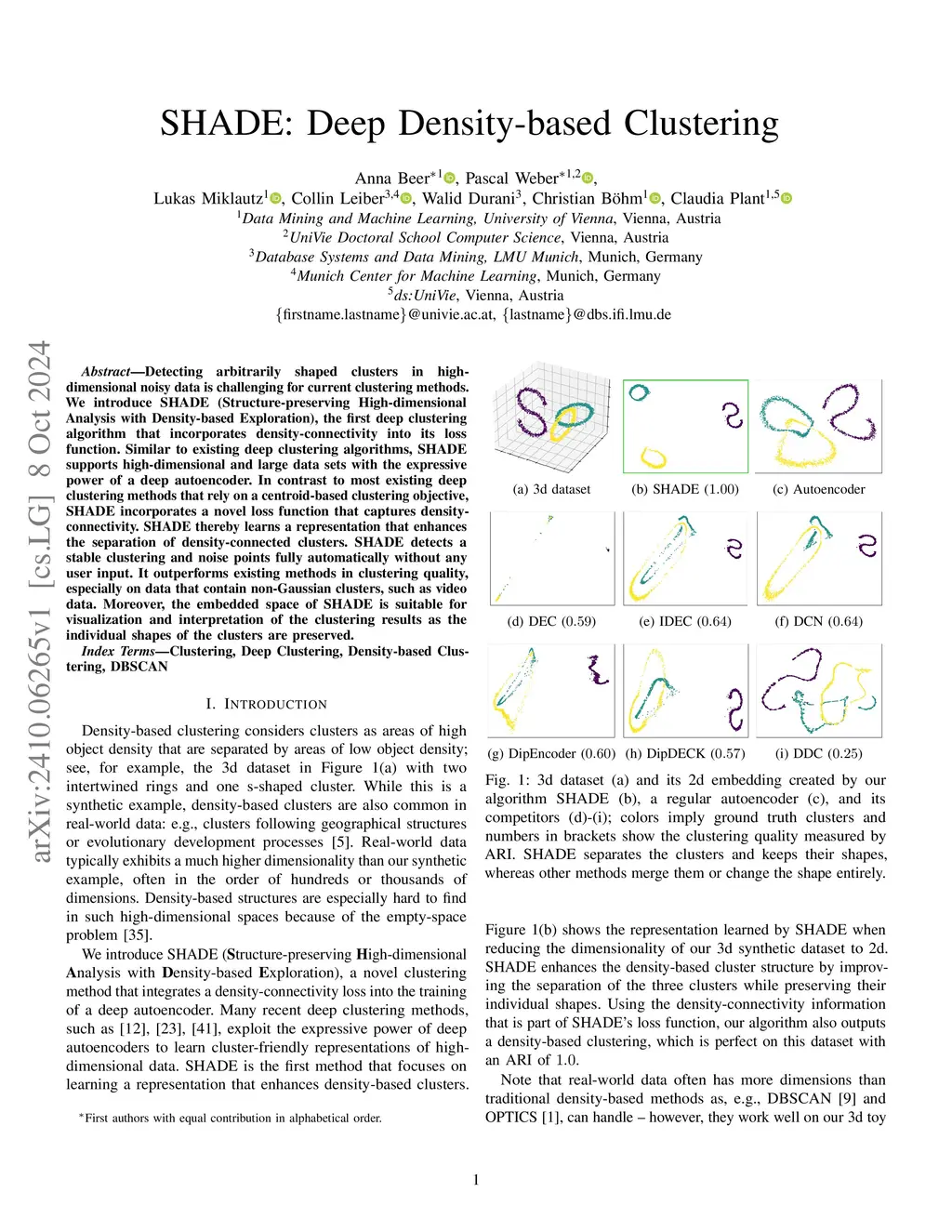 Detecting arbitrarily shaped clusters in high-dimensional noisy data is challenging for current clustering methods. We introduce SHADE (Structure-preserving High-dimensional Analysis with Density-based Exploration), the first deep clustering algorithm that incorporates density-connectivity into its loss function. Similar to existing deep clustering algorithms, SHADE supports high-dimensional and large data sets with the expressive power of a deep autoencoder. In contrast to most existing deep clustering methods that rely on a centroid-based clustering objective, SHADE incorporates a novel loss function that captures density-connectivity. SHADE thereby learns a representation that enhances the separation of density-connected clusters. SHADE detects a stable clustering and noise points fully automatically without any user input. It outperforms existing methods in clustering quality, especially on data that contain non-Gaussian clusters, such as video data. Moreover, the embedded space of SHADE is suitable for visualization and interpretation of the clustering results as the individual shapes of the clusters are preserved.