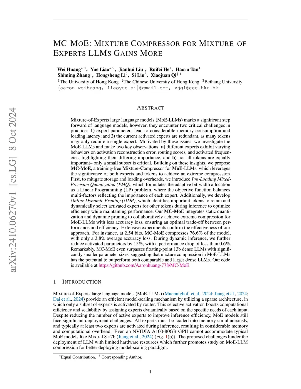 Mixture-of-Experts large language models (MoE-LLMs) marks a significant step forward of language models, however, they encounter two critical challenges in practice: 1) expert parameters lead to considerable memory consumption and loading latency; and 2) the current activated experts are redundant, as many tokens may only require a single expert. Motivated by these issues, we investigate the MoE-LLMs and make two key observations: a) different experts exhibit varying behaviors on activation reconstruction error, routing scores, and activated frequencies, highlighting their differing importance, and b) not all tokens are equally important -- only a small subset is critical. Building on these insights, we propose MC, a training-free Mixture-Compressor for MoE-LLMs, which leverages the significance of both experts and tokens to achieve an extreme compression. First, to mitigate storage and loading overheads, we introduce Pre-Loading Mixed-Precision Quantization, which formulates the adaptive bit-width allocation as a Linear Programming problem, where the objective function balances multi-factors reflecting the importance of each expert. Additionally, we develop Online Dynamic Pruning, which identifies important tokens to retain and dynamically select activated experts for other tokens during inference to optimize efficiency while maintaining performance. Our MC integrates static quantization and dynamic pruning to collaboratively achieve extreme compression for MoE-LLMs with less accuracy loss, ensuring an optimal trade-off between performance and efficiency. Extensive experiments confirm the effectiveness of our approach. For instance, at 2.54 bits, MC compresses 76.6% of the model, with only a 3.8% average accuracy loss. During dynamic inference, we further reduce activated parameters by 15%, with a performance drop of less than 0.6%.