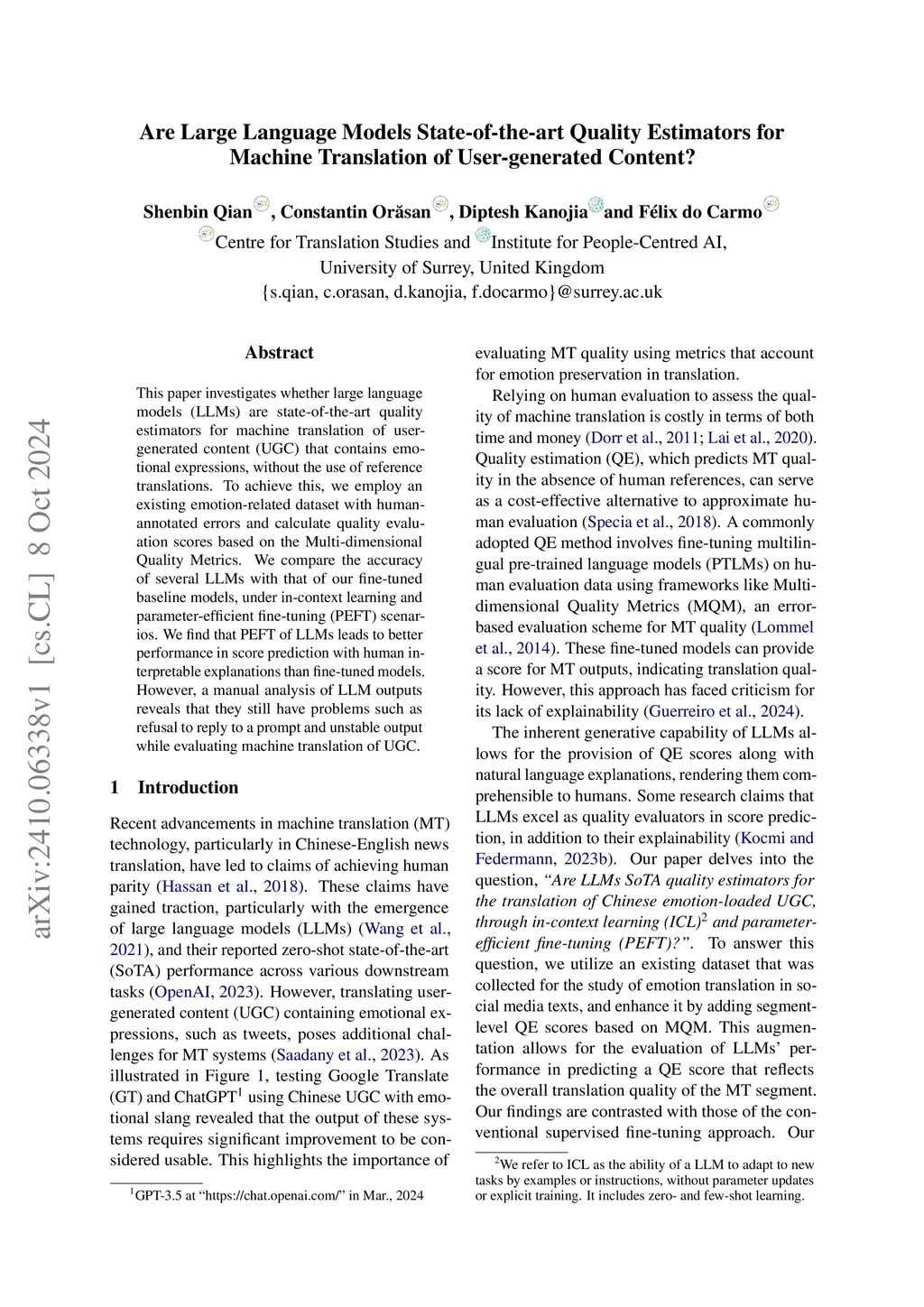 This paper investigates whether large language models (LLMs) are state-of-the-art quality estimators for machine translation of user-generated content (UGC) that contains emotional expressions, without the use of reference translations. To achieve this, we employ an existing emotion-related dataset with human-annotated errors and calculate quality evaluation scores based on the Multi-dimensional Quality Metrics. We compare the accuracy of several LLMs with that of our fine-tuned baseline models, under in-context learning and parameter-efficient fine-tuning (PEFT) scenarios. We find that PEFT of LLMs leads to better performance in score prediction with human interpretable explanations than fine-tuned models. However, a manual analysis of LLM outputs reveals that they still have problems such as refusal to reply to a prompt and unstable output while evaluating machine translation of UGC.