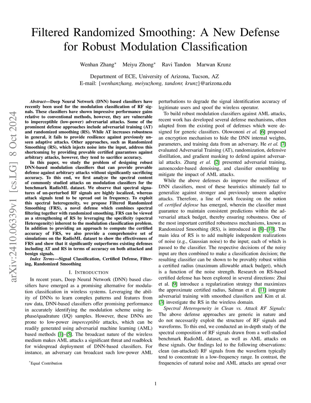 Deep Neural Network (DNN) based classifiers have recently been used for the modulation classification of RF signals. These classifiers have shown impressive performance gains relative to conventional methods, however, they are vulnerable to imperceptible (low-power) adversarial attacks. Some of the prominent defense approaches include adversarial training (AT) and randomized smoothing (RS). While AT increases robustness in general, it fails to provide resilience against previously unseen adaptive attacks. Other approaches, such as Randomized Smoothing (RS), which injects noise into the input, address this shortcoming by providing provable certified guarantees against arbitrary attacks, however, they tend to sacrifice accuracy. In this paper, we study the problem of designing robust DNN-based modulation classifiers that can provide provable defense against arbitrary attacks without significantly sacrificing accuracy. To this end, we first analyze the spectral content of commonly studied attacks on modulation classifiers for the benchmark RadioML dataset. We observe that spectral signatures of un-perturbed RF signals are highly localized, whereas attack signals tend to be spread out in frequency. To exploit this spectral heterogeneity, we propose Filtered Randomized Smoothing (FRS), a novel defense which combines spectral filtering together with randomized smoothing. FRS can be viewed as a strengthening of RS by leveraging the specificity (spectral Heterogeneity) inherent to the modulation classification problem. In addition to providing an approach to compute the certified accuracy of FRS, we also provide a comprehensive set of simulations on the RadioML dataset to show the effectiveness of FRS and show that it significantly outperforms existing defenses including AT and RS in terms of accuracy on both attacked and benign signals.