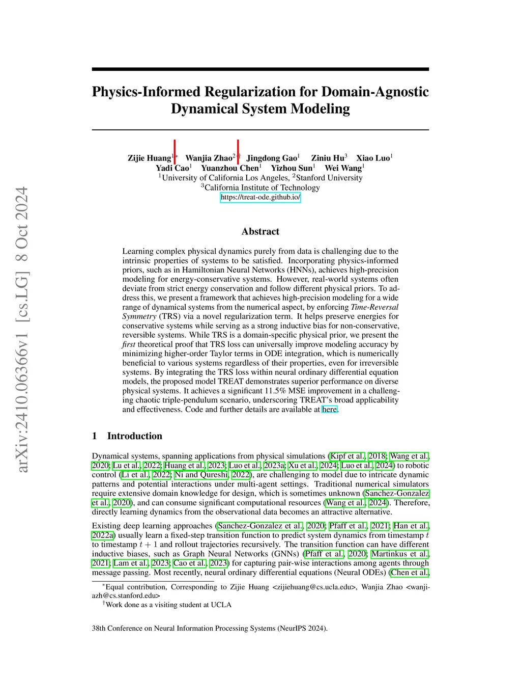 Learning complex physical dynamics purely from data is challenging due to the intrinsic properties of systems to be satisfied. Incorporating physics-informed priors, such as in Hamiltonian Neural Networks (HNNs), achieves high-precision modeling for energy-conservative systems. However, real-world systems often deviate from strict energy conservation and follow different physical priors. To address this, we present a framework that achieves high-precision modeling for a wide range of dynamical systems from the numerical aspect, by enforcing Time-Reversal Symmetry (TRS) via a novel regularization term. It helps preserve energies for conservative systems while serving as a strong inductive bias for non-conservative, reversible systems. While TRS is a domain-specific physical prior, we present the first theoretical proof that TRS loss can universally improve modeling accuracy by minimizing higher-order Taylor terms in ODE integration, which is numerically beneficial to various systems regardless of their properties, even for irreversible systems. By integrating the TRS loss within neural ordinary differential equation models, the proposed model TREAT demonstrates superior performance on diverse physical systems. It achieves a significant 11.5% MSE improvement in a challenging chaotic triple-pendulum scenario, underscoring TREAT's broad applicability and effectiveness.