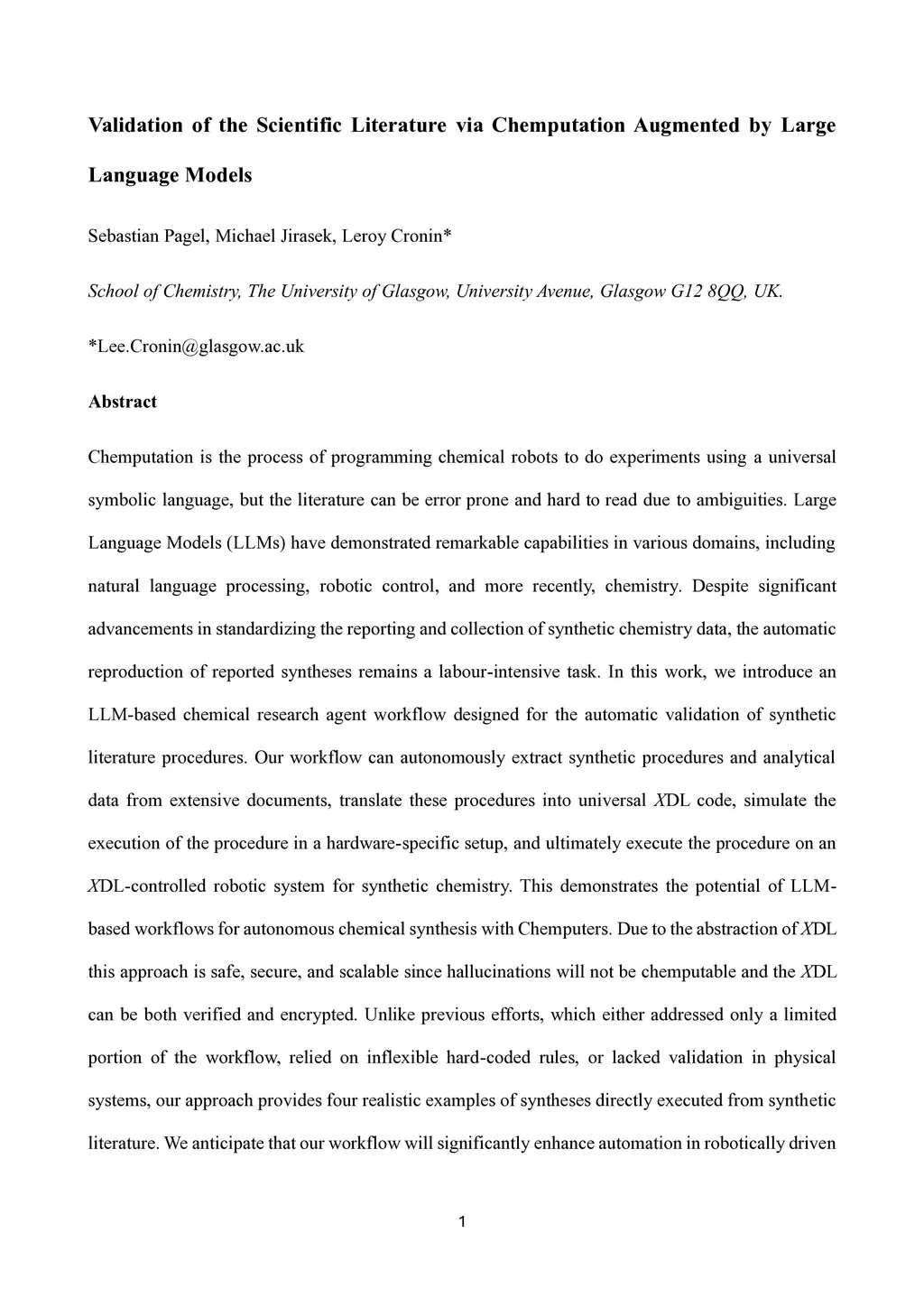 Chemputation is the process of programming chemical robots to do experiments using a universal symbolic language, but the literature can be error prone and hard to read due to ambiguities. Large Language Models (LLMs) have demonstrated remarkable capabilities in various domains, including natural language processing, robotic control, and more recently, chemistry. Despite significant advancements in standardizing the reporting and collection of synthetic chemistry data, the automatic reproduction of reported syntheses remains a labour-intensive task. In this work, we introduce an LLM-based chemical research agent workflow designed for the automatic validation of synthetic literature procedures. Our workflow can autonomously extract synthetic procedures and analytical data from extensive documents, translate these procedures into universal XDL code, simulate the execution of the procedure in a hardware-specific setup, and ultimately execute the procedure on an XDL-controlled robotic system for synthetic chemistry. This demonstrates the potential of LLM-based workflows for autonomous chemical synthesis with Chemputers. Due to the abstraction of XDL this approach is safe, secure, and scalable since hallucinations will not be chemputable and the XDL can be both verified and encrypted. Unlike previous efforts, which either addressed only a limited portion of the workflow, relied on inflexible hard-coded rules, or lacked validation in physical systems, our approach provides four realistic examples of syntheses directly executed from synthetic literature. We anticipate that our workflow will significantly enhance automation in robotically driven synthetic chemistry research, streamline data extraction, improve the reproducibility, scalability, and safety of synthetic and experimental chemistry.