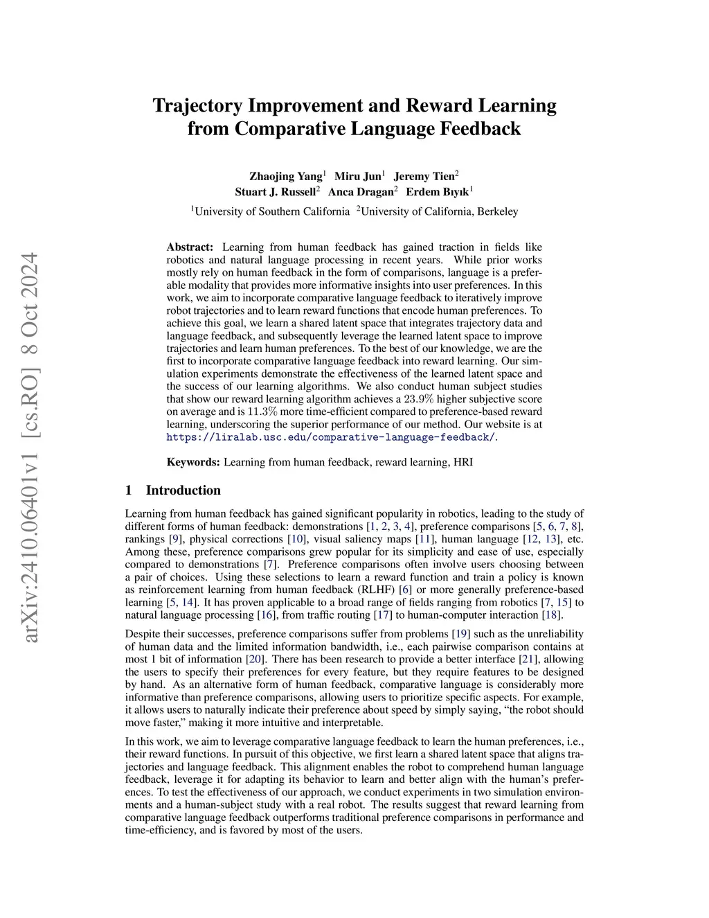 Trajectory Improvement and Reward Learning from Comparative Language