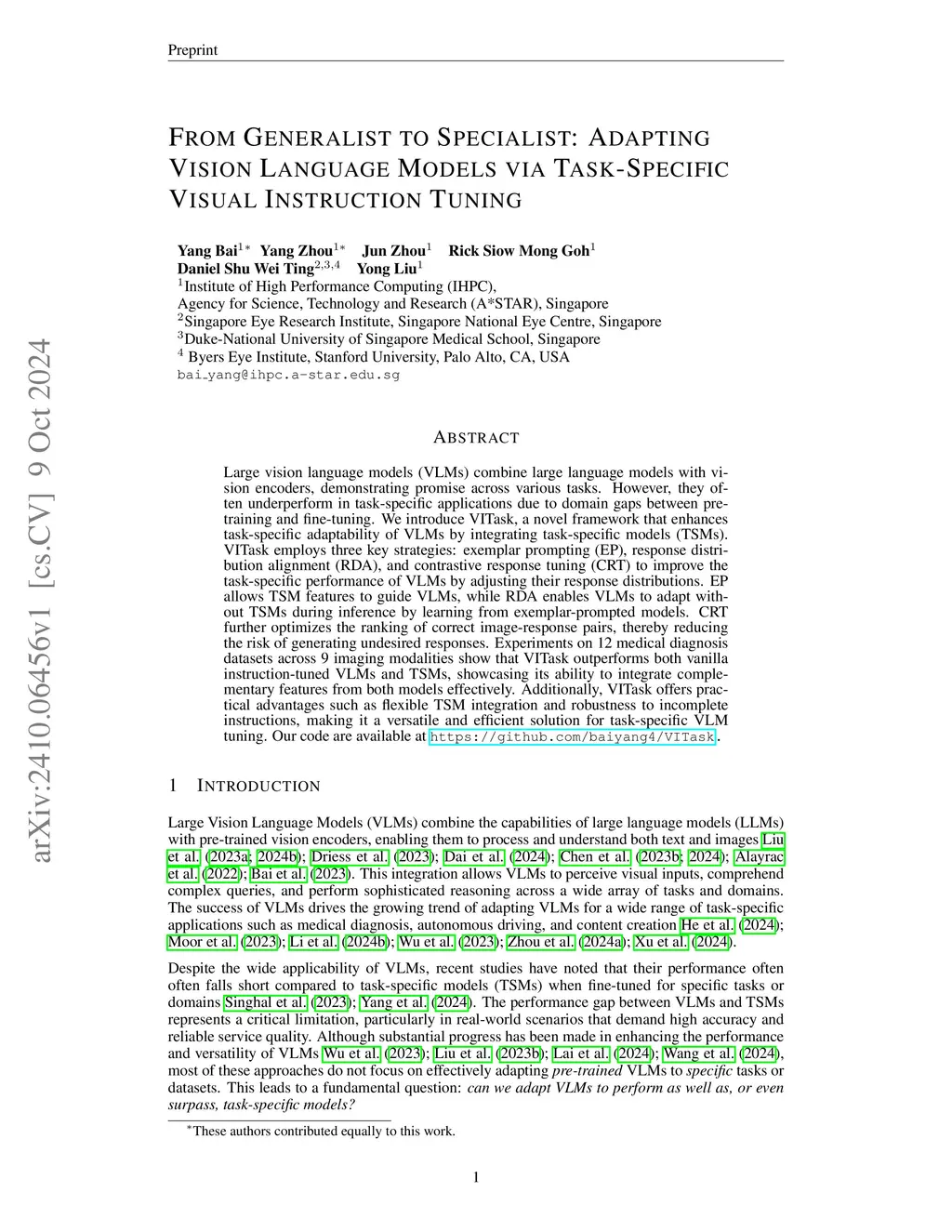 Large vision language models (VLMs) combine large language models with vision encoders, demonstrating promise across various tasks. However, they often underperform in task-specific applications due to domain gaps between pre-training and fine-tuning. We introduce VITask, a novel framework that enhances task-specific adaptability of VLMs by integrating task-specific models (TSMs). VITask employs three key strategies: exemplar prompting (EP), response distribution alignment (RDA), and contrastive response tuning (CRT) to improve the task-specific performance of VLMs by adjusting their response distributions. EP allows TSM features to guide VLMs, while RDA enables VLMs to adapt without TSMs during inference by learning from exemplar-prompted models. CRT further optimizes the ranking of correct image-response pairs, thereby reducing the risk of generating undesired responses. Experiments on 12 medical diagnosis datasets across 9 imaging modalities show that VITask outperforms both vanilla instruction-tuned VLMs and TSMs, showcasing its ability to integrate complementary features from both models effectively. Additionally, VITask offers practical advantages such as flexible TSM integration and robustness to incomplete instructions, making it a versatile and efficient solution for task-specific VLM tuning. Our code are available at https://github.com/baiyang4/VITask.