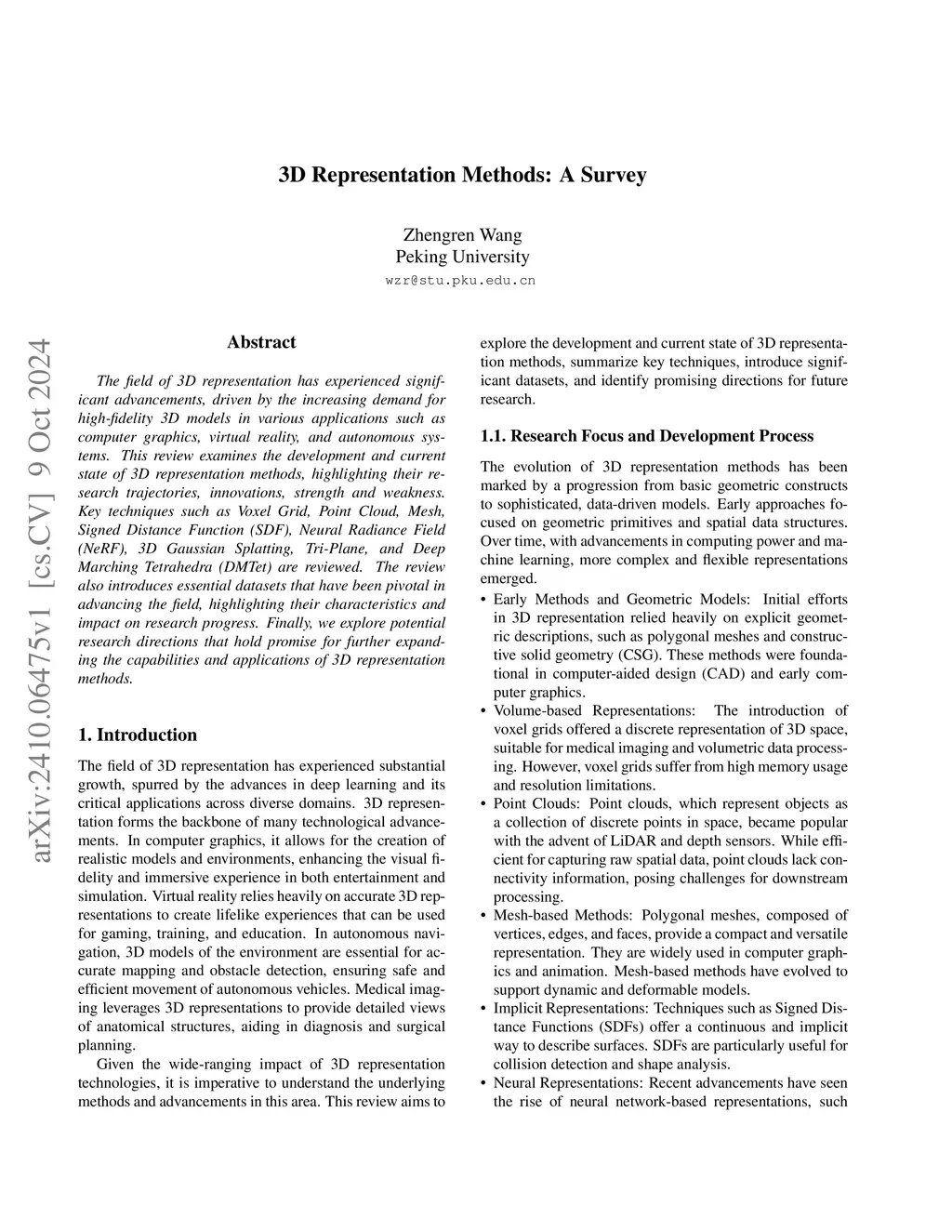The field of 3D representation has experienced significant advancements, driven by the increasing demand for high-fidelity 3D models in various applications such as computer graphics, virtual reality, and autonomous systems. This review examines the development and current state of 3D representation methods, highlighting their research trajectories, innovations, strength and weakness. Key techniques such as Voxel Grid, Point Cloud, Mesh, Signed Distance Function (SDF), Neural Radiance Field (NeRF), 3D Gaussian Splatting, Tri-Plane, and Deep Marching Tetrahedra (DMTet) are reviewed. The review also introduces essential datasets that have been pivotal in advancing the field, highlighting their characteristics and impact on research progress. Finally, we explore potential research directions that hold promise for further expanding the capabilities and applications of 3D representation methods.