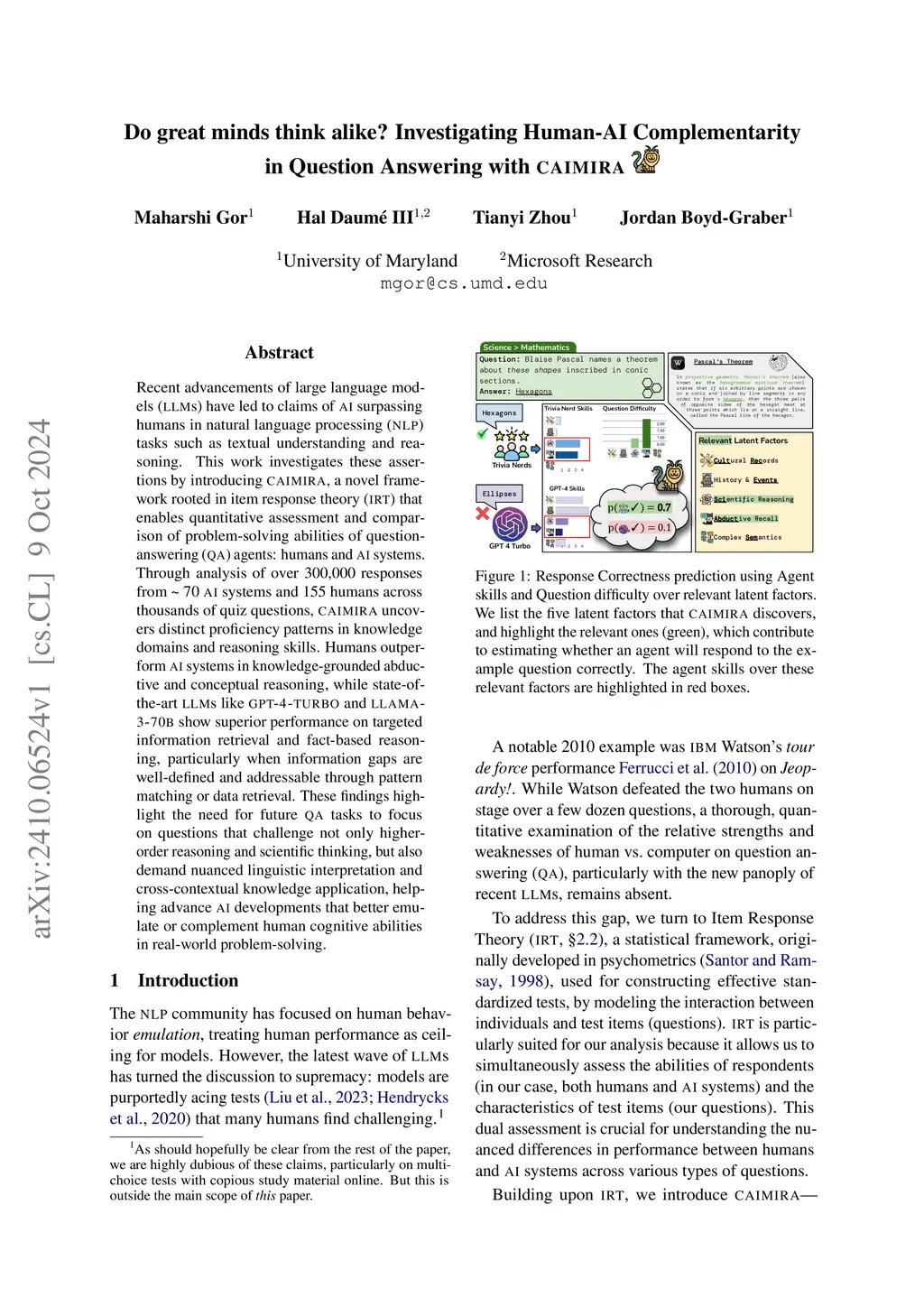 Recent advancements of large language models (LLMs) have led to claims of AI surpassing humans in natural language processing (NLP) tasks such as textual understanding and reasoning. This work investigates these assertions by introducing CAIMIRA, a novel framework rooted in item response theory (IRT) that enables quantitative assessment and comparison of problem-solving abilities of question-answering (QA) agents: humans and AI systems. Through analysis of over 300,000 responses from ~70 AI systems and 155 humans across thousands of quiz questions, CAIMIRA uncovers distinct proficiency patterns in knowledge domains and reasoning skills. Humans outperform AI systems in knowledge-grounded abductive and conceptual reasoning, while state-of-the-art LLMs like GPT-4 and LLaMA show superior performance on targeted information retrieval and fact-based reasoning, particularly when information gaps are well-defined and addressable through pattern matching or data retrieval. These findings highlight the need for future QA tasks to focus on questions that challenge not only higher-order reasoning and scientific thinking, but also demand nuanced linguistic interpretation and cross-contextual knowledge application, helping advance AI developments that better emulate or complement human cognitive abilities in real-world problem-solving.