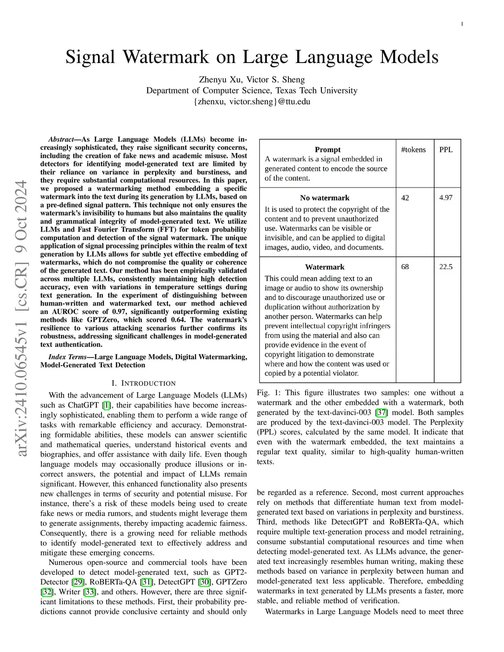 As Large Language Models (LLMs) become increasingly sophisticated, they raise significant security concerns, including the creation of fake news and academic misuse. Most detectors for identifying model-generated text are limited by their reliance on variance in perplexity and burstiness, and they require substantial computational resources. In this paper, we proposed a watermarking method embedding a specific watermark into the text during its generation by LLMs, based on a pre-defined signal pattern. This technique not only ensures the watermark's invisibility to humans but also maintains the quality and grammatical integrity of model-generated text. We utilize LLMs and Fast Fourier Transform (FFT) for token probability computation and detection of the signal watermark. The unique application of signal processing principles within the realm of text generation by LLMs allows for subtle yet effective embedding of watermarks, which do not compromise the quality or coherence of the generated text. Our method has been empirically validated across multiple LLMs, consistently maintaining high detection accuracy, even with variations in temperature settings during text generation. In the experiment of distinguishing between human-written and watermarked text, our method achieved an AUROC score of 0.97, significantly outperforming existing methods like GPTZero, which scored 0.64. The watermark's resilience to various attacking scenarios further confirms its robustness, addressing significant challenges in model-generated text authentication.