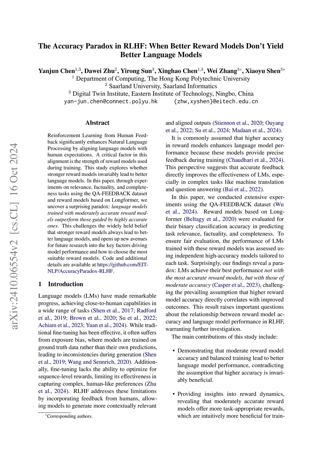Reinforcement Learning from Human Feedback significantly enhances Natural Language Processing by aligning language models with human expectations. A critical factor in this alignment is the strength of reward models used during training. This study explores whether stronger reward models invariably lead to better language models. In this paper, through experiments on relevance, factuality, and completeness tasks using the QA-FEEDBACK dataset and reward models based on Longformer, we uncover a surprising paradox: language models trained with moderately accurate reward models outperform those guided by highly accurate ones. This challenges the widely held belief that stronger reward models always lead to better language models, and opens up new avenues for future research into the key factors driving model performance and how to choose the most suitable reward models. Code and additional details are available at https://github.com/EIT-NLP/AccuracyParadox-RLHF.