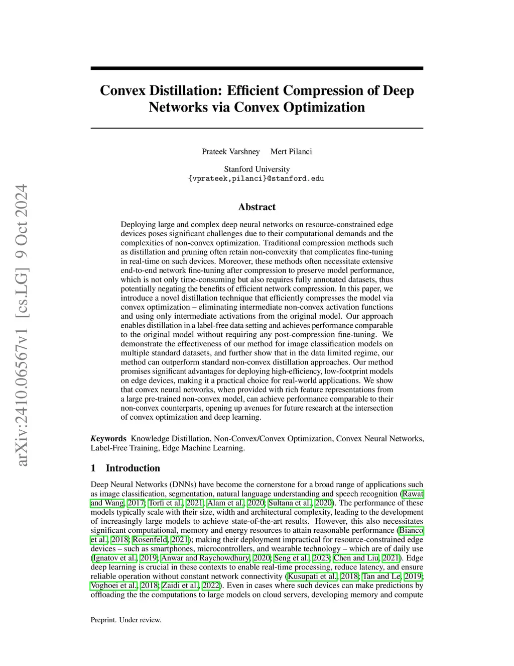 Deploying large and complex deep neural networks on resource-constrained edge devices poses significant challenges due to their computational demands and the complexities of non-convex optimization. Traditional compression methods such as distillation and pruning often retain non-convexity that complicates fine-tuning in real-time on such devices. Moreover, these methods often necessitate extensive end-to-end network fine-tuning after compression to preserve model performance, which is not only time-consuming but also requires fully annotated datasets, thus potentially negating the benefits of efficient network compression. In this paper, we introduce a novel distillation technique that efficiently compresses the model via convex optimization -- eliminating intermediate non-convex activation functions and using only intermediate activations from the original model. Our approach enables distillation in a label-free data setting and achieves performance comparable to the original model without requiring any post-compression fine-tuning. We demonstrate the effectiveness of our method for image classification models on multiple standard datasets, and further show that in the data limited regime, our method can outperform standard non-convex distillation approaches. Our method promises significant advantages for deploying high-efficiency, low-footprint models on edge devices, making it a practical choice for real-world applications. We show that convex neural networks, when provided with rich feature representations from a large pre-trained non-convex model, can achieve performance comparable to their non-convex counterparts, opening up avenues for future research at the intersection of convex optimization and deep learning.