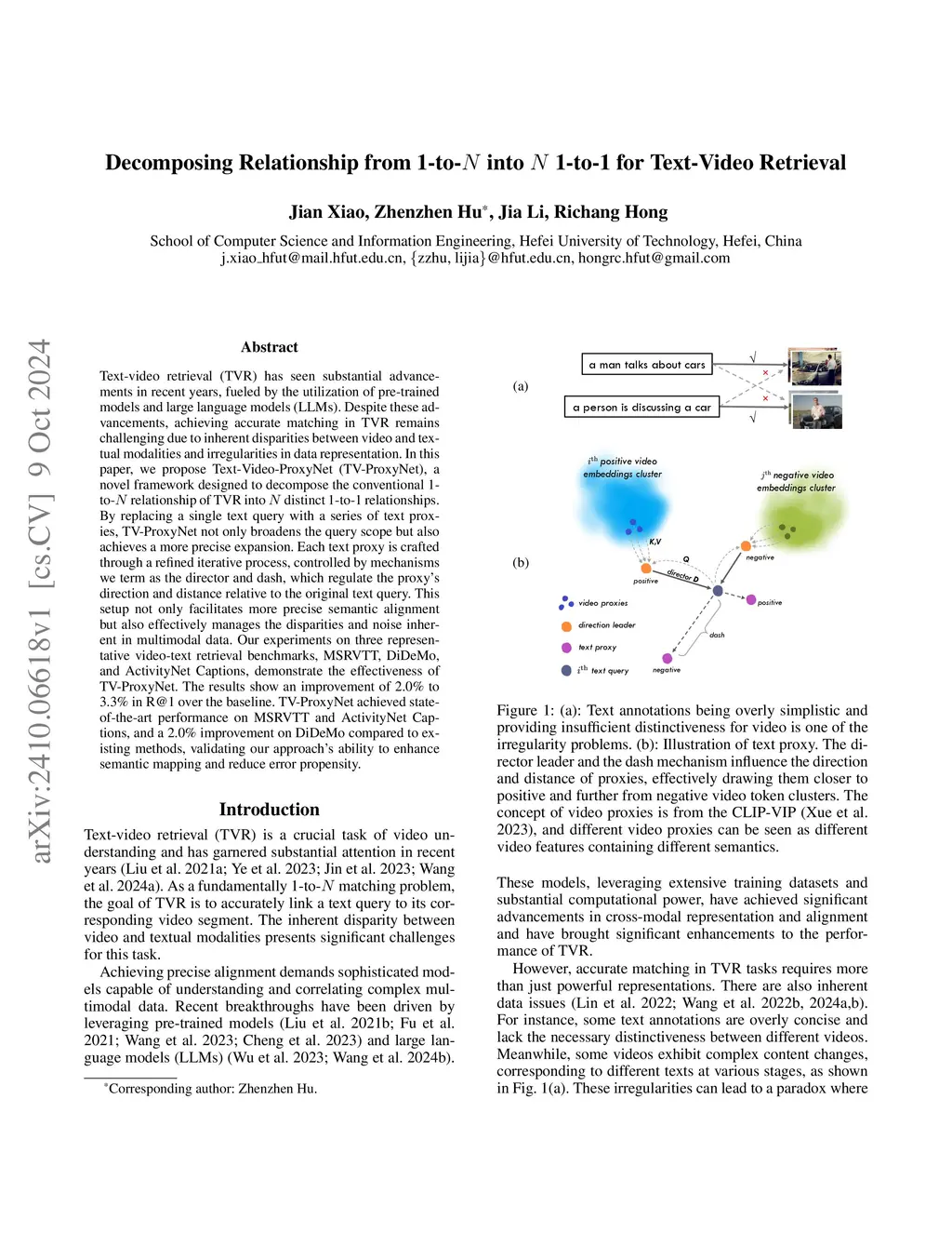 Text-video retrieval (TVR) has seen substantial advancements in recent years, fueled by the utilization of pre-trained models and large language models (LLMs). Despite these advancements, achieving accurate matching in TVR remains challenging due to inherent disparities between video and textual modalities and irregularities in data representation. In this paper, we propose Text-Video-ProxyNet (TV-ProxyNet), a novel framework designed to decompose the conventional 1-to-N relationship of TVR into N distinct 1-to-1 relationships. By replacing a single text query with a series of text proxies, TV-ProxyNet not only broadens the query scope but also achieves a more precise expansion. Each text proxy is crafted through a refined iterative process, controlled by mechanisms we term as the director and dash, which regulate the proxy's direction and distance relative to the original text query. This setup not only facilitates more precise semantic alignment but also effectively manages the disparities and noise inherent in multimodal data. Our experiments on three representative video-text retrieval benchmarks, MSRVTT, DiDeMo, and ActivityNet Captions, demonstrate the effectiveness of TV-ProxyNet. The results show an improvement of 2.0% to 3.3% in R@1 over the baseline. TV-ProxyNet achieved state-of-the-art performance on MSRVTT and ActivityNet Captions, and a 2.0% improvement on DiDeMo compared to existing methods, validating our approach's ability to enhance semantic mapping and reduce error propensity.