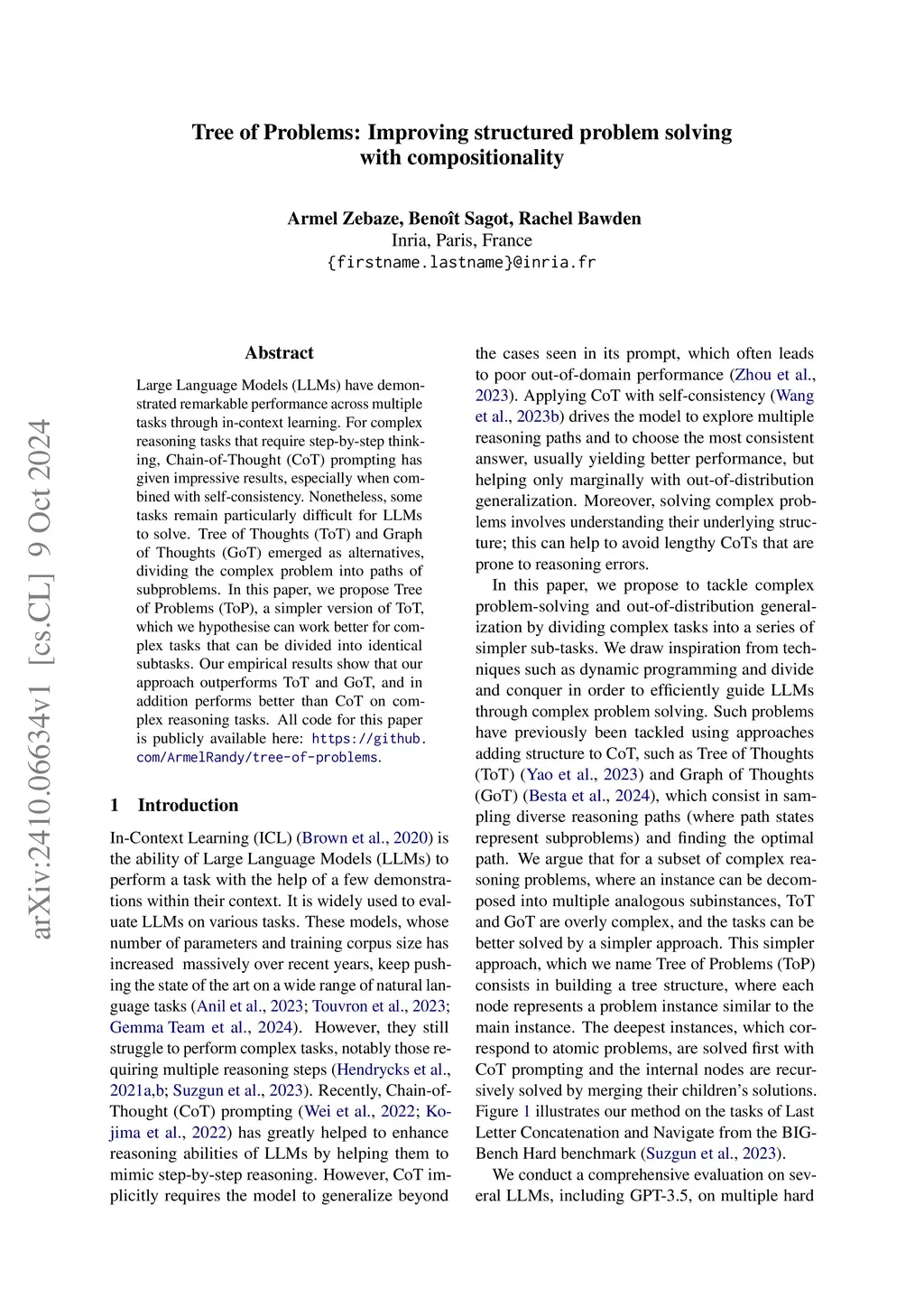 Large Language Models (LLMs) have demonstrated remarkable performance across multiple tasks through in-context learning. For complex reasoning tasks that require step-by-step thinking, Chain-of-Thought (CoT) prompting has given impressive results, especially when combined with self-consistency. Nonetheless, some tasks remain particularly difficult for LLMs to solve. Tree of Thoughts (ToT) and Graph of Thoughts (GoT) emerged as alternatives, dividing the complex problem into paths of subproblems. In this paper, we propose Tree of Problems (ToP), a simpler version of ToT, which we hypothesise can work better for complex tasks that can be divided into identical subtasks. Our empirical results show that our approach outperforms ToT and GoT, and in addition performs better than CoT on complex reasoning tasks. All code for this paper is publicly available here: https://github.com/ArmelRandy/tree-of-problems.