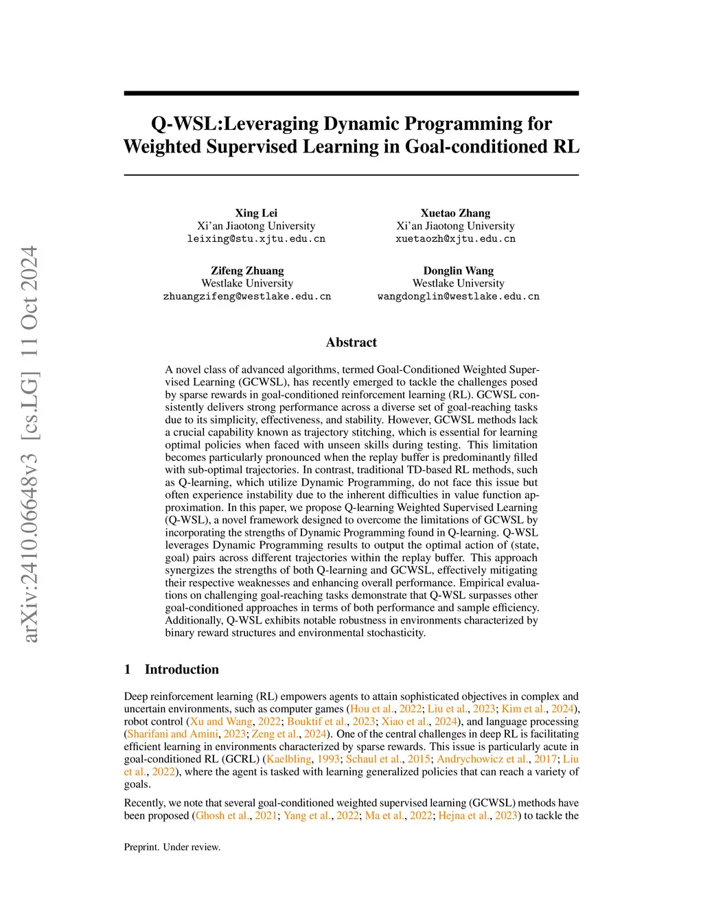 A novel class of advanced algorithms, termed Goal-Conditioned Weighted Supervised Learning (GCWSL), has recently emerged to tackle the challenges posed by sparse rewards in goal-conditioned reinforcement learning (RL). GCWSL consistently delivers strong performance across a diverse set of goal-reaching tasks due to its simplicity, effectiveness, and stability. However, GCWSL methods lack a crucial capability known as trajectory stitching, which is essential for learning optimal policies when faced with unseen skills during testing. This limitation becomes particularly pronounced when the replay buffer is predominantly filled with sub-optimal trajectories. In contrast, traditional TD-based RL methods, such as Q-learning, which utilize Dynamic Programming, do not face this issue but often experience instability due to the inherent difficulties in value function approximation. In this paper, we propose Q-learning Weighted Supervised Learning (Q-WSL), a novel framework designed to overcome the limitations of GCWSL by incorporating the strengths of Dynamic Programming found in Q-learning. Q-WSL leverages Dynamic Programming results to output the optimal action of (state, goal) pairs across different trajectories within the replay buffer. This approach synergizes the strengths of both Q-learning and GCWSL, effectively mitigating their respective weaknesses and enhancing overall performance. Empirical evaluations on challenging goal-reaching tasks demonstrate that Q-WSL surpasses other goal-conditioned approaches in terms of both performance and sample efficiency. Additionally, Q-WSL exhibits notable robustness in environments characterized by binary reward structures and environmental stochasticity.